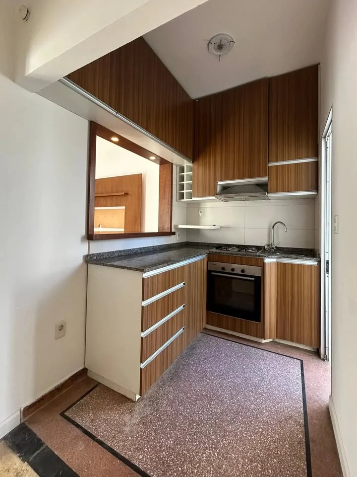 Cocina con muebles sobre y bajo mesada equipada (horno, anafe, y campana extractora).