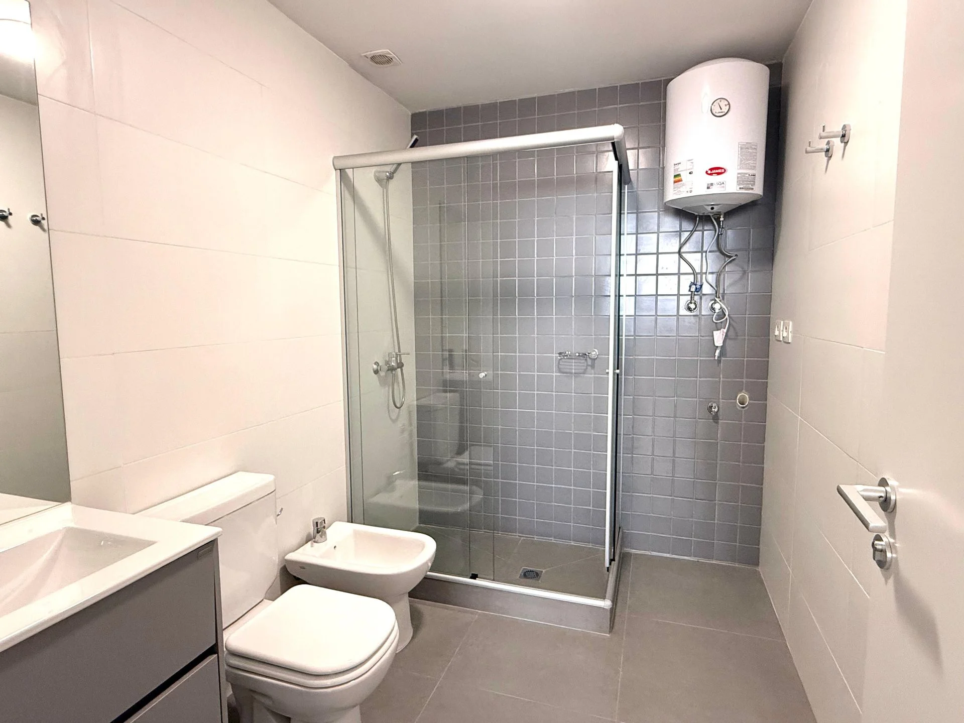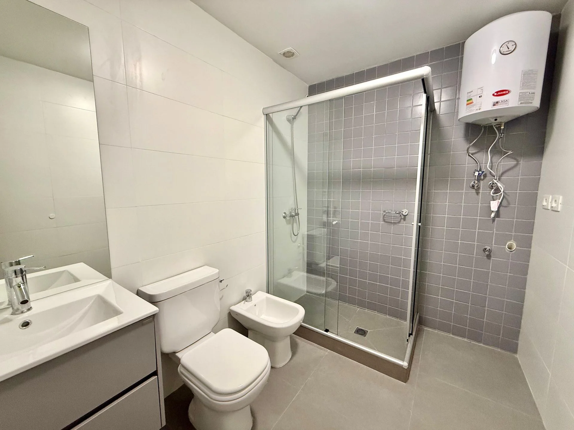 -En el baño: calefón, mampara y espejo.