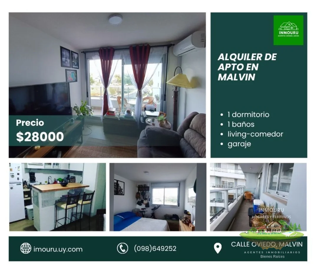 Alquilo lindo y Moderno Apto en Malvin en complejo cerrado ubicado en la calle Oviedo cerca de Av Italia zona muy tranquila, 3piso por ascensor con balcón al frente con una espectacular vista, un dormitorio, living con un ventanal amplio con buena luminosidad, cocina con desayunador , baño, área de lavandería y garaje. ideal para una pareja.