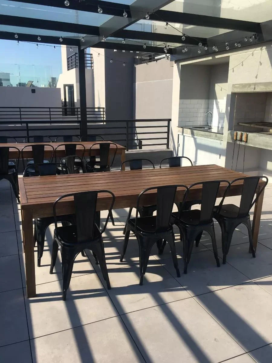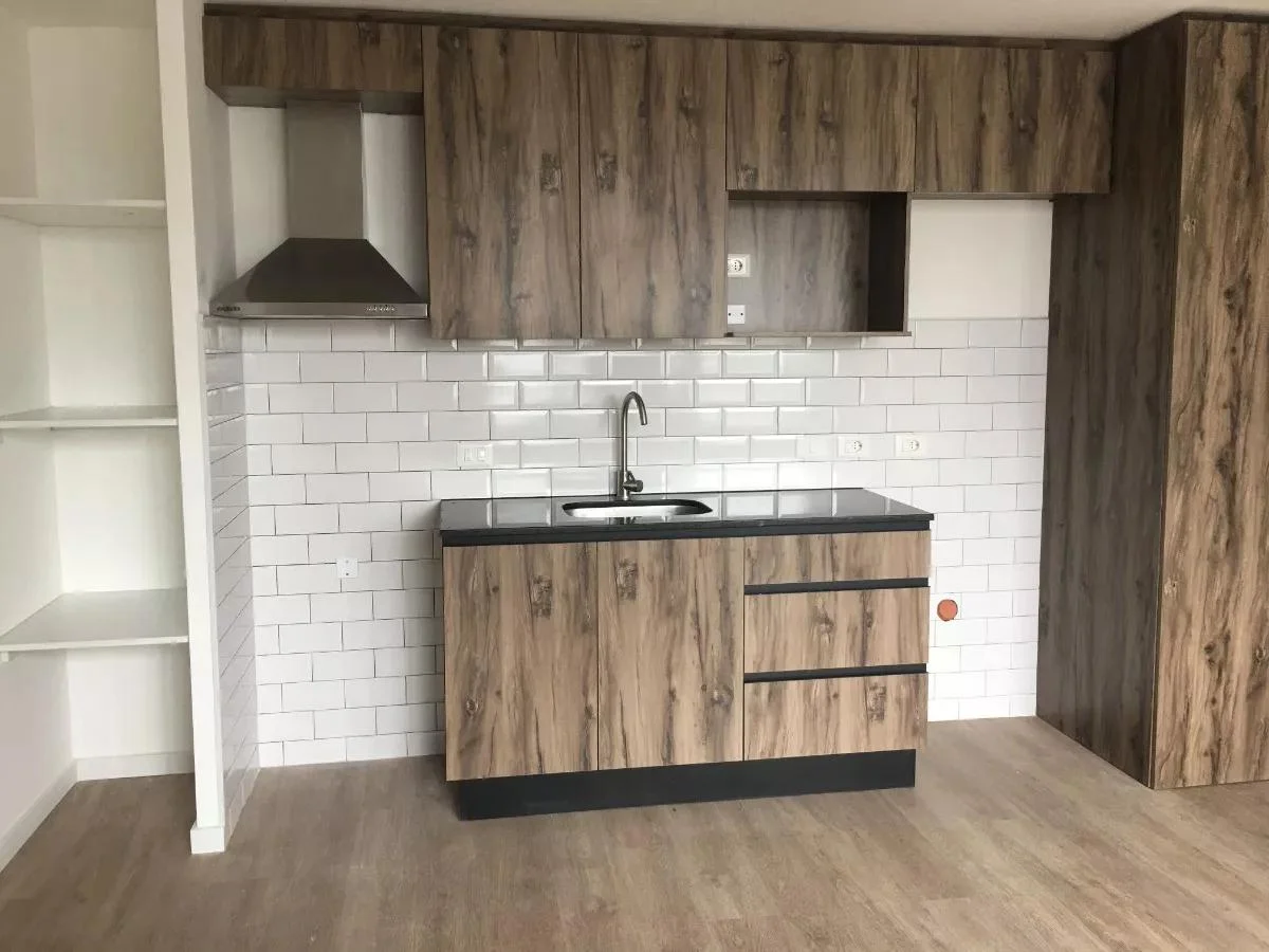 El apartamento cuenta con una cocina integrada equipada con placares bajo mesada y aéreos, una campana extractora y un equipo de aire acondicionado. También incluye un placard extra que alberga el calefón instalado y la conexión para un lavarropas. Adicionalmente, dispone de una terraza lavadero y un baño completo.