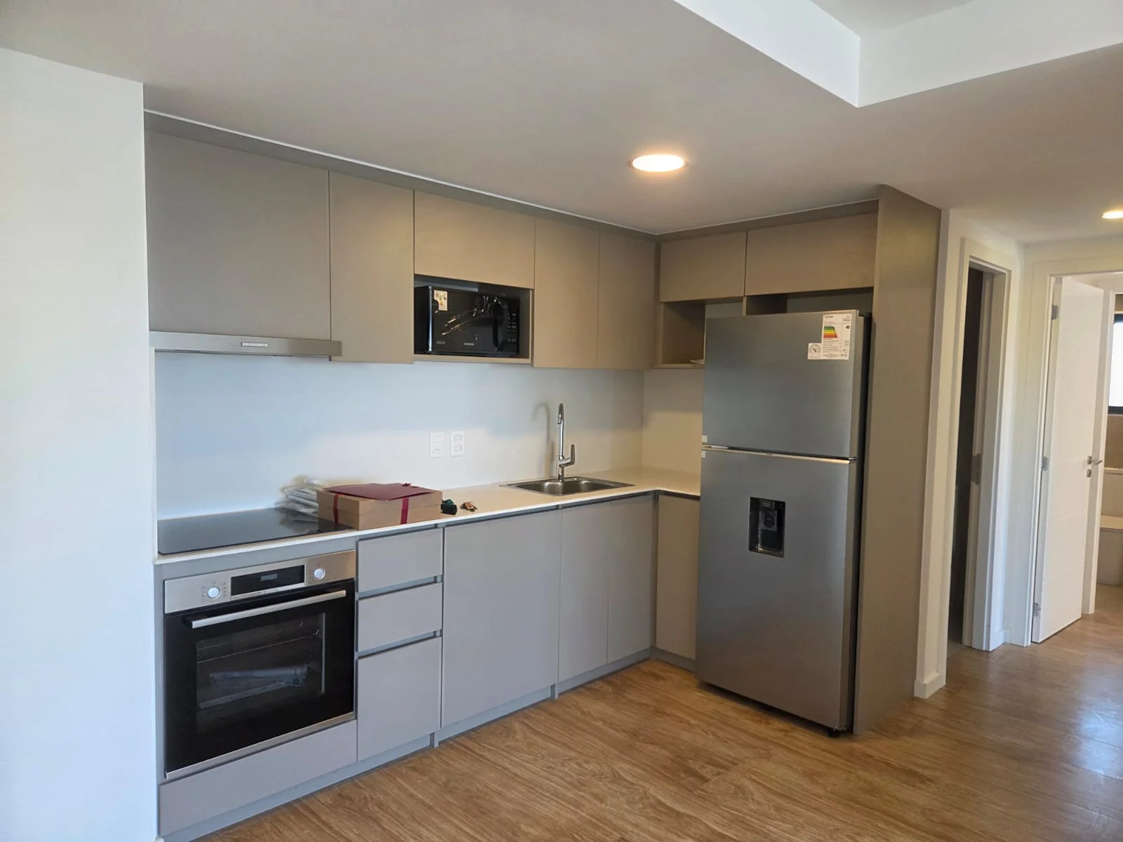 Cocina equipada con electrodomésticos a estrenaqr, anafe Bosch, horno eléctrico, microondas, heladera y calefón.