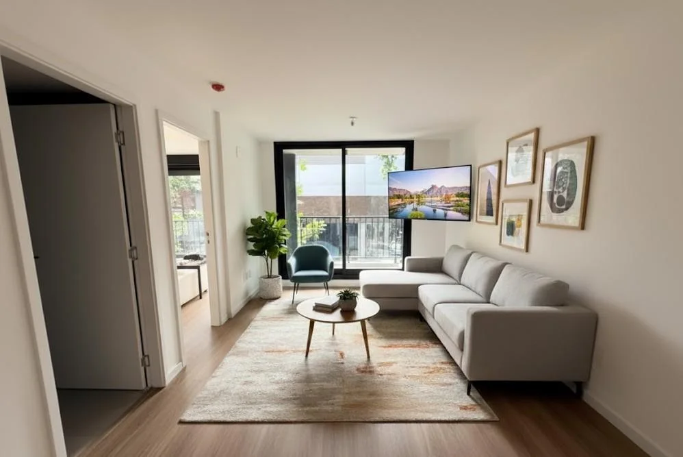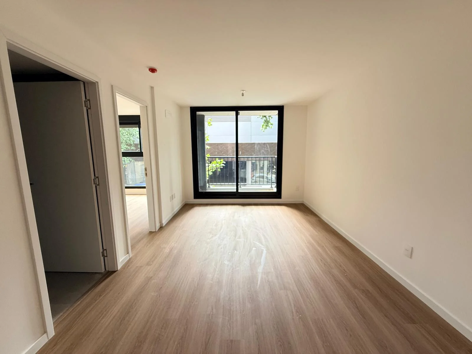 Living orientado al este con acceso al balcón.