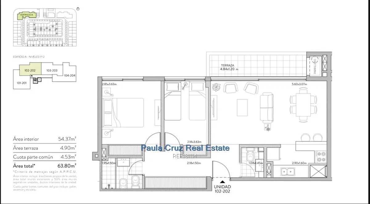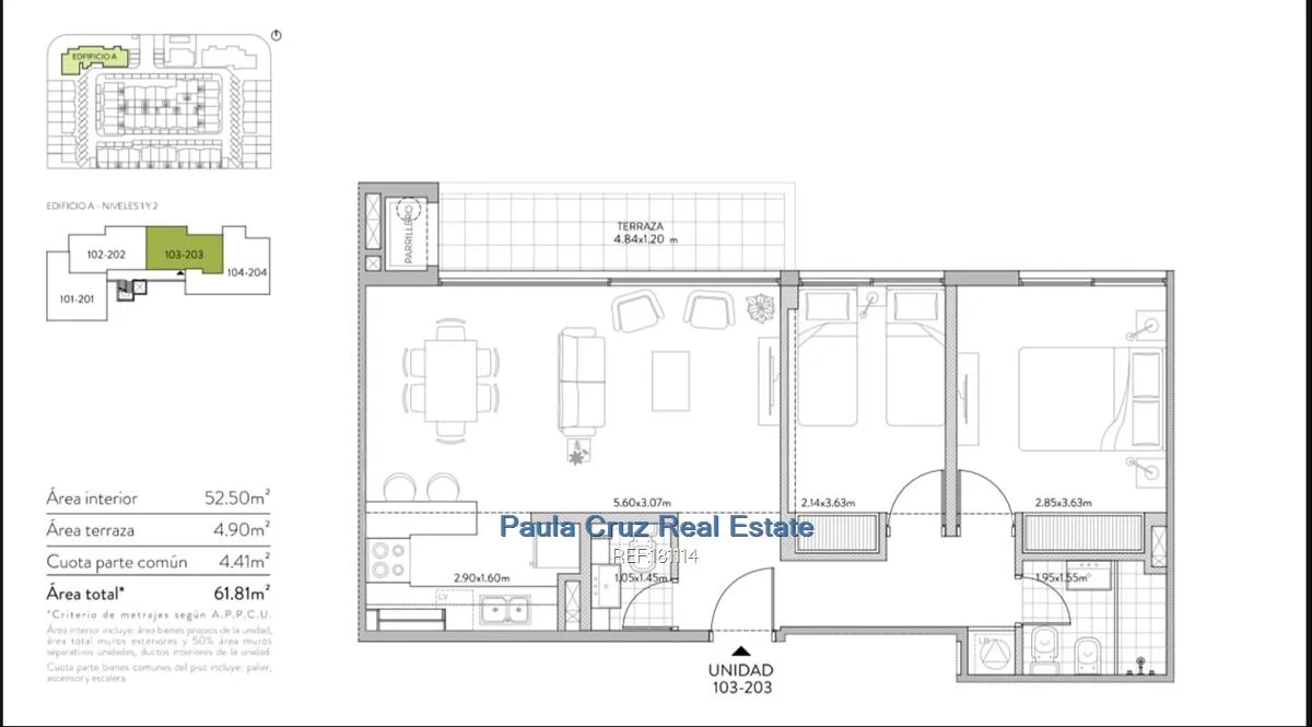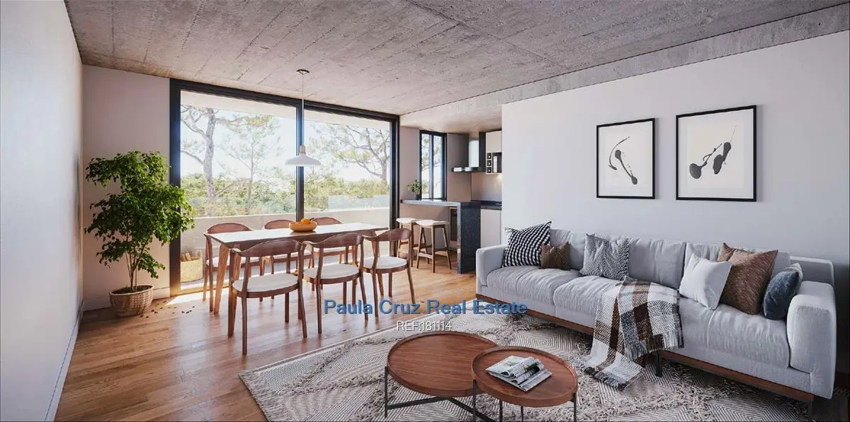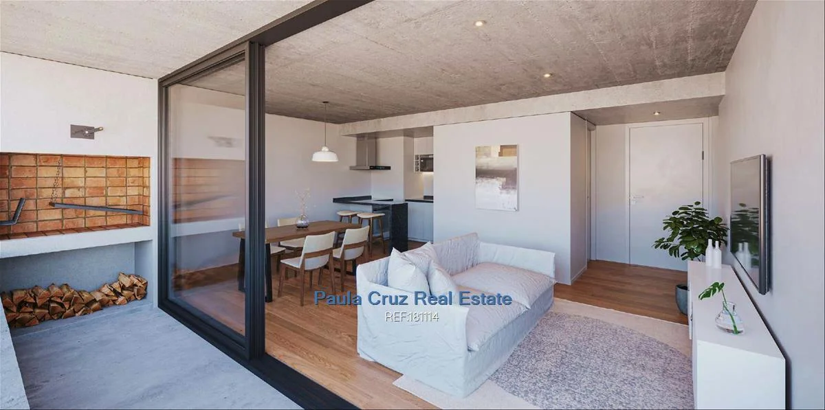 Amplio living comedor con salida a terraza con parrillero. Cocina integrada con barra, se entrega con horno, anafe y campana de extracción eléctricos. Baño social. 2 dormitorios con placares. Baño completo, previsión para estufa y previsión para aire