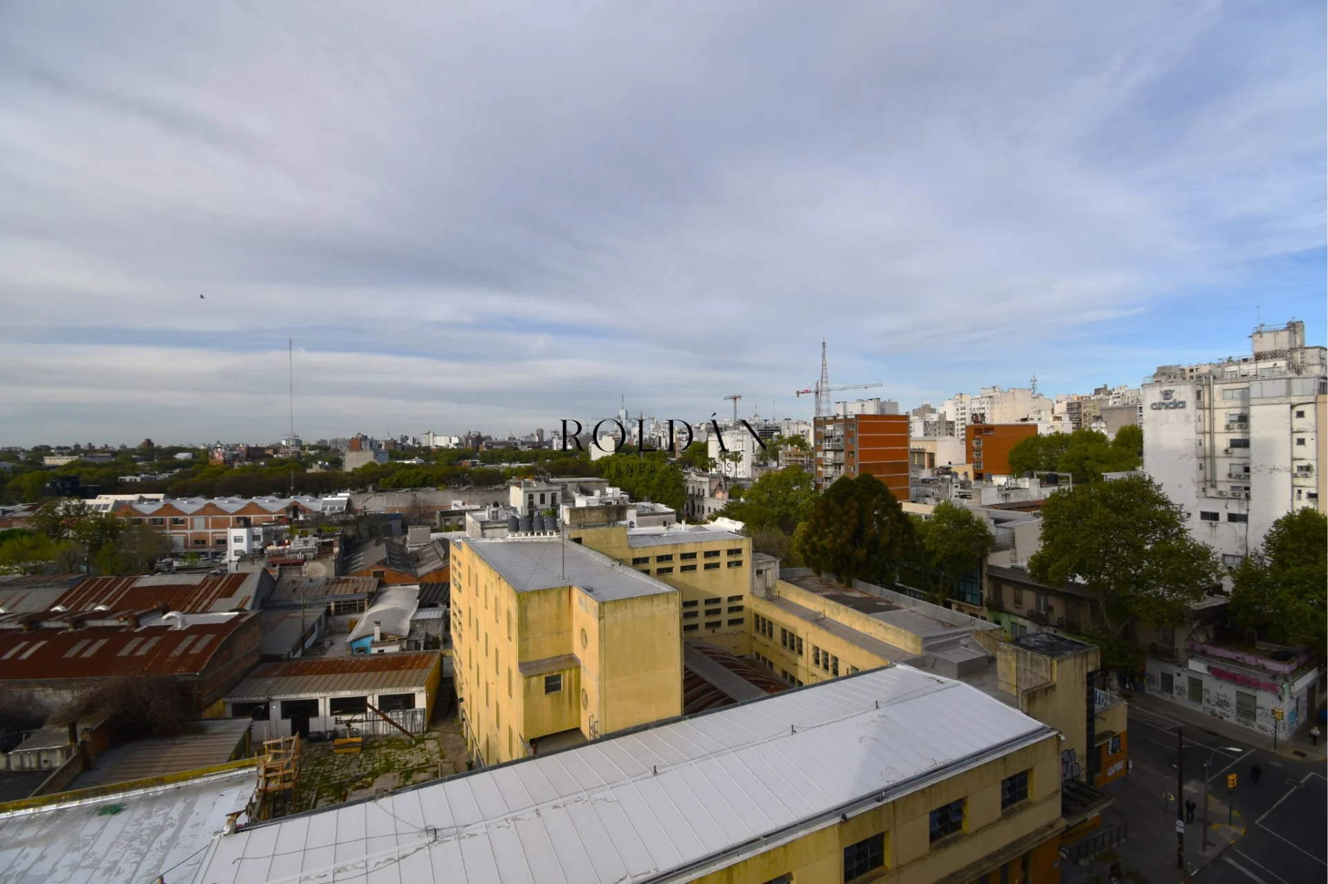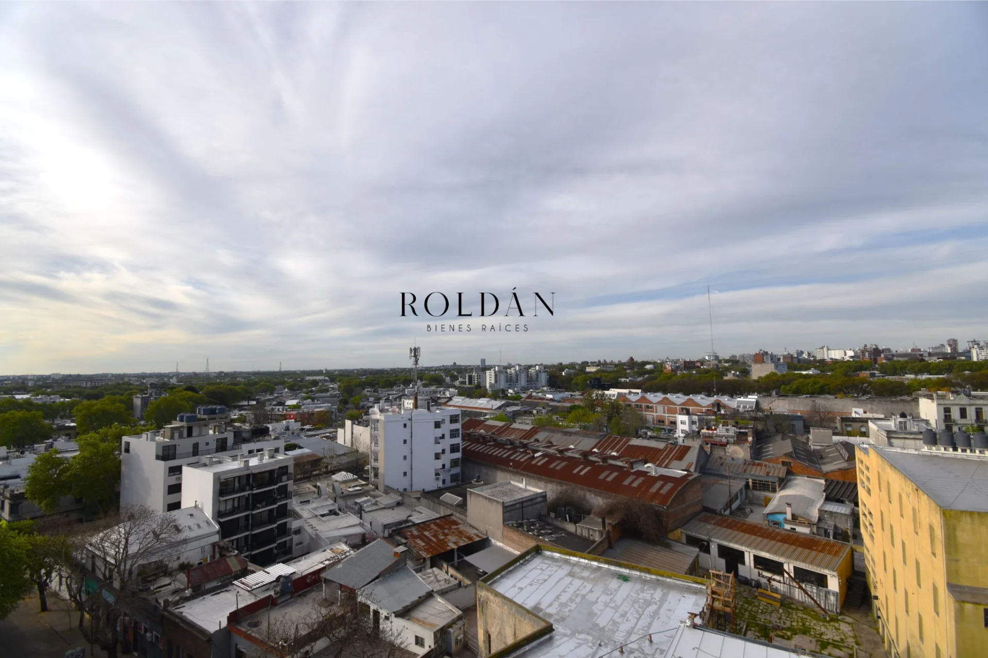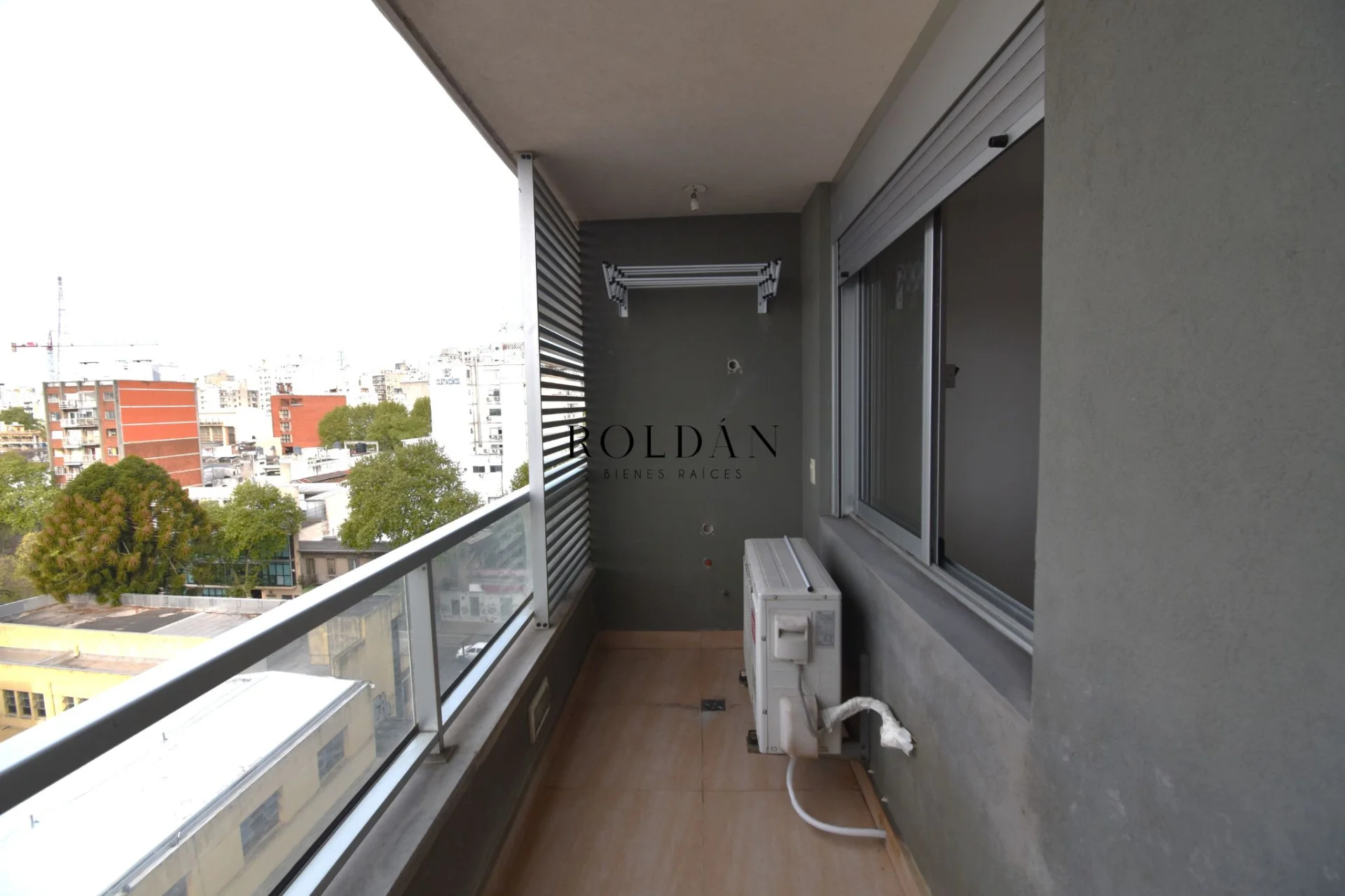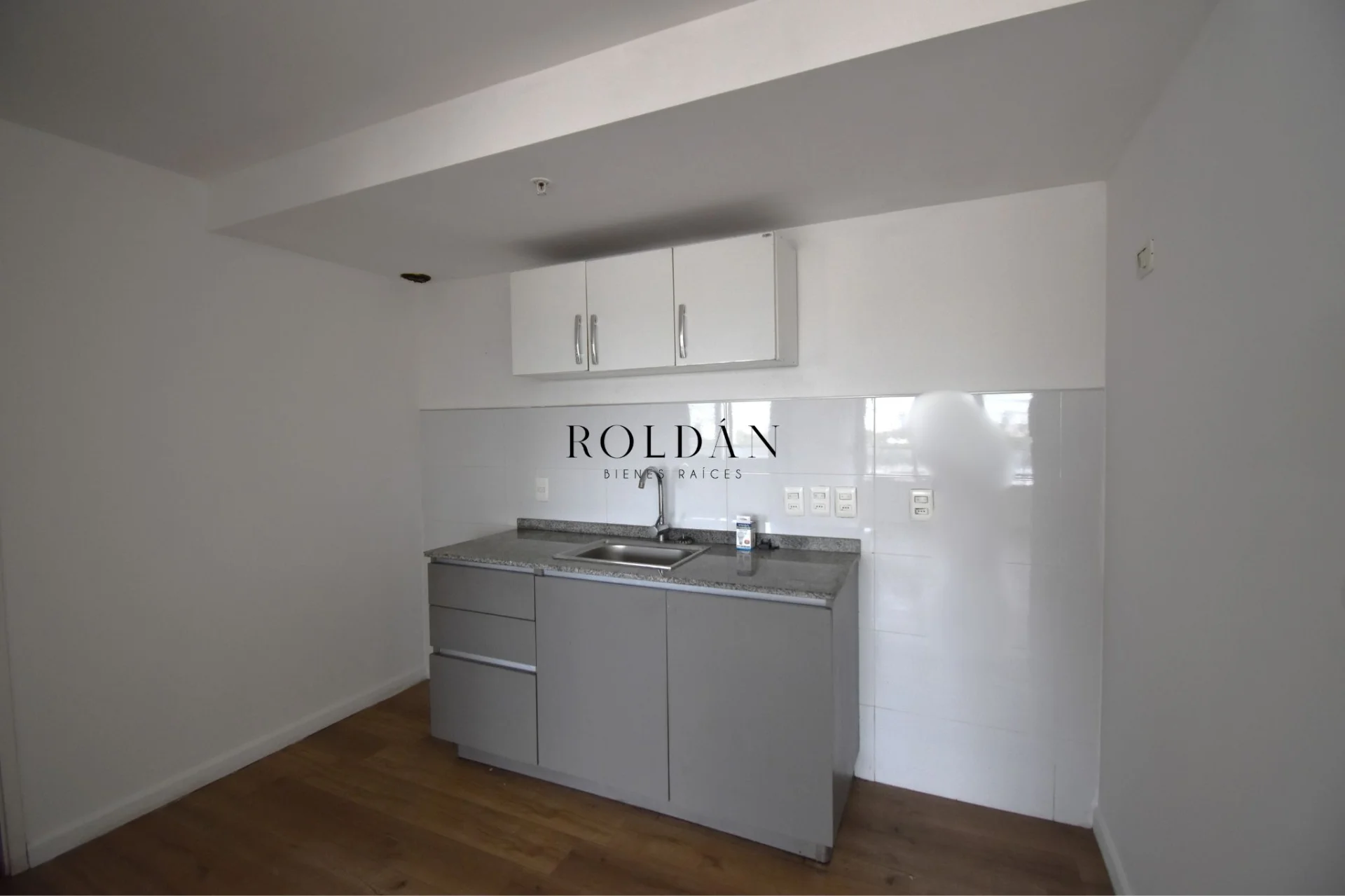 Living comedor al frente con amplia ventana con persiana y aire acondicionado, salida a terraza disfrutable. Cocina integrada con muebles aéreo y bajo mesada.
