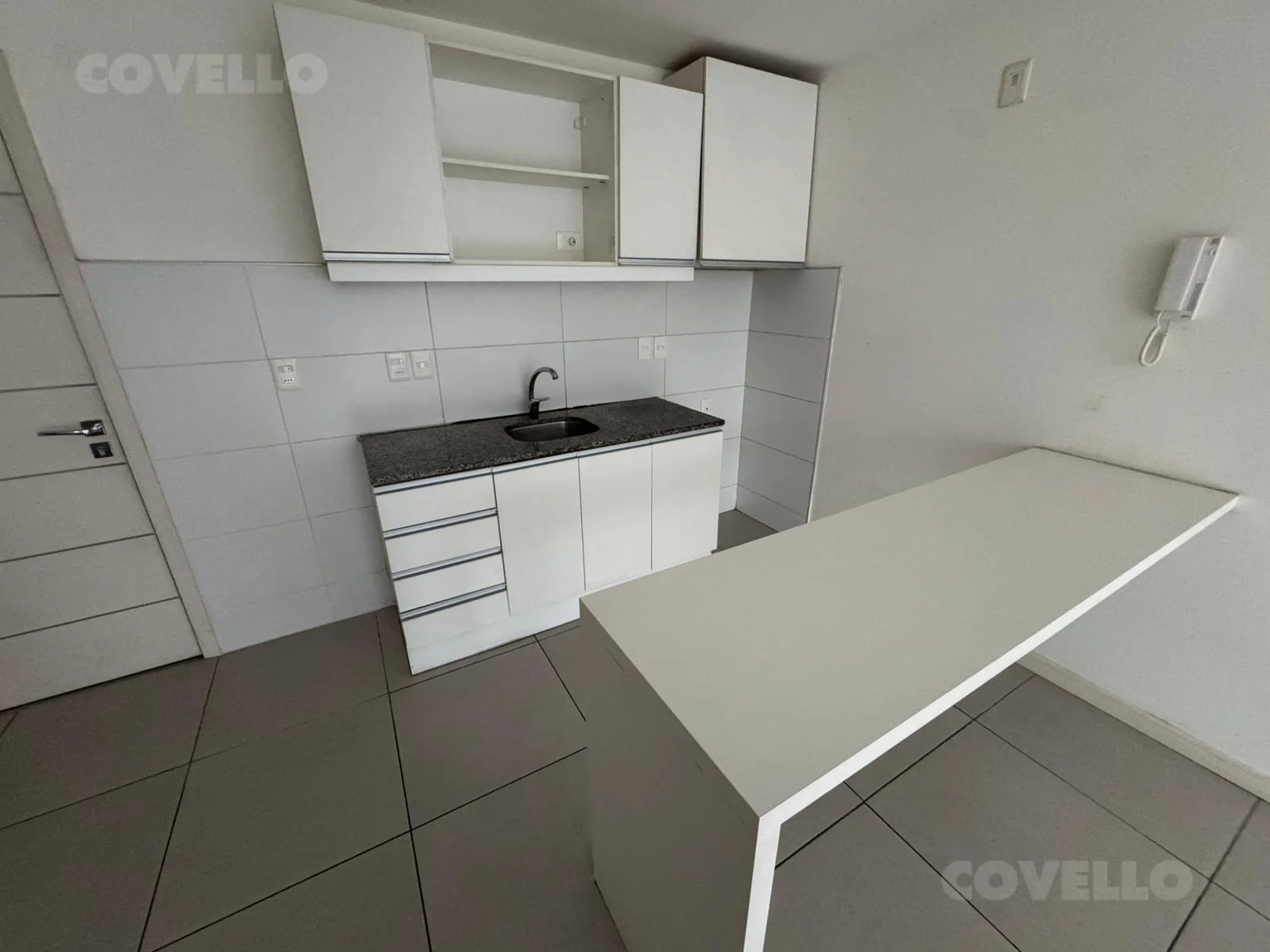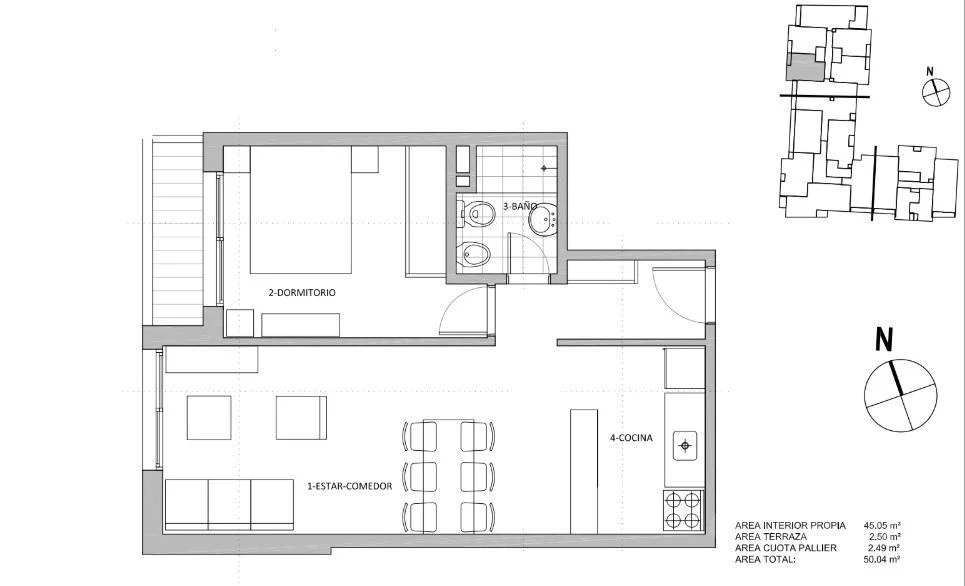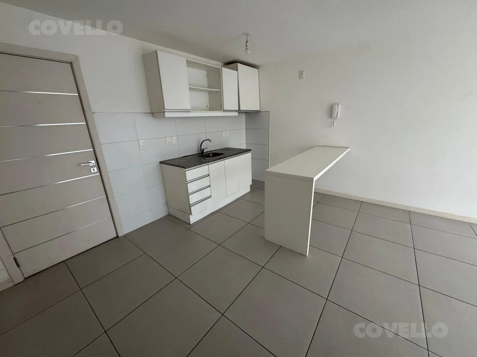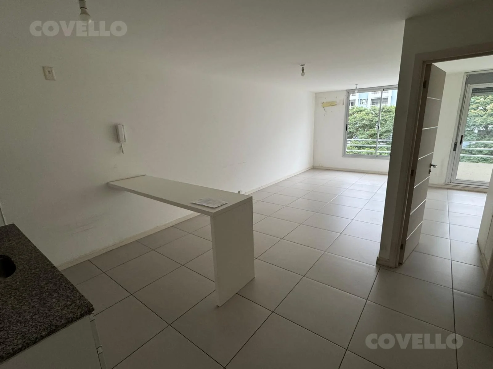 Cuenta con cocina integrada tipo barra, equipada con placares bajo y sobre mesada y mesada de granito. El área social se compone de un amplio living comedor con ventanales al frente y salida al balcón desde el dormitorio con conexión para el lavarropas.