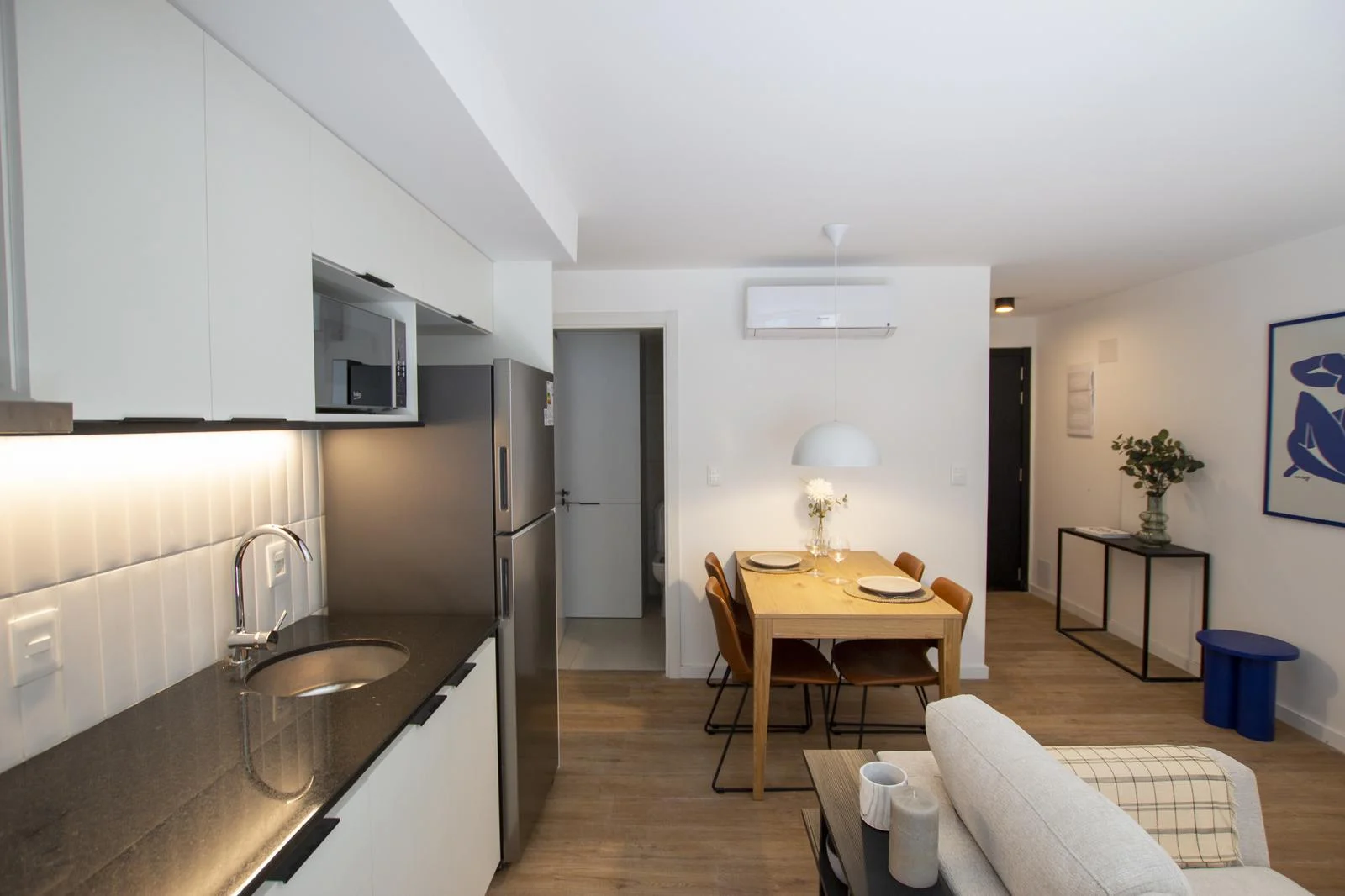 Kitchenette que se entregará con muebles sobre y bajo mesada, con campana extractora y anafe.