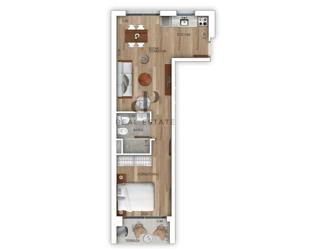 Apartamento al frente, de 1 dormitorio. Living comedor, cocina integrada con muebles sobre y bajo mesada. 1 dormitorio con salida a terraza lavadero. Baño completo. Aire acondicionado en living y comedor.