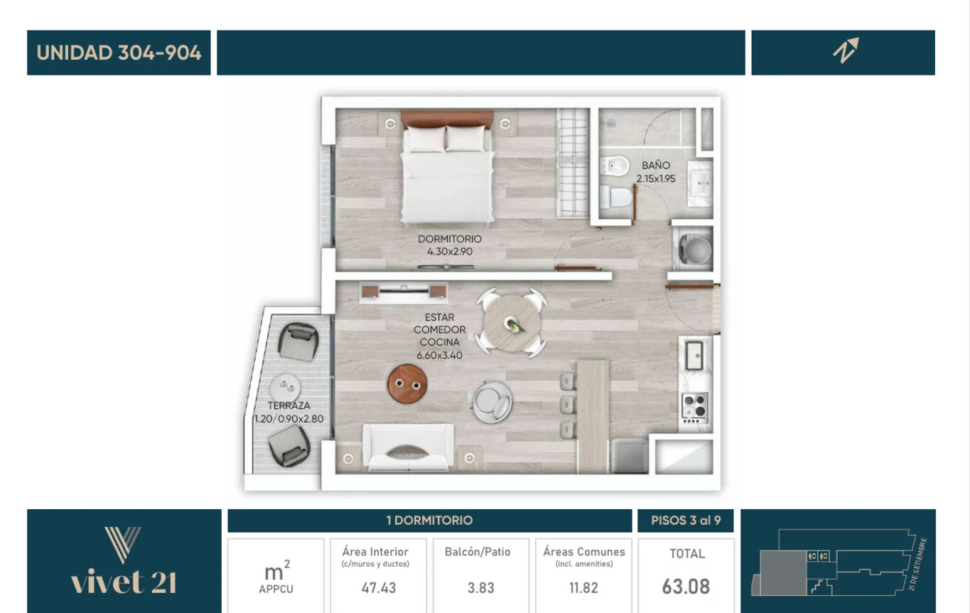 Este apartamento ofrece una propuesta moderna y funcional, pensada para el estilo de vida actual. Ambientes versátiles, amplia iluminación y ventilación natural, y una terraza protagonista que integra interior y exterior para disfrutar al máximo.