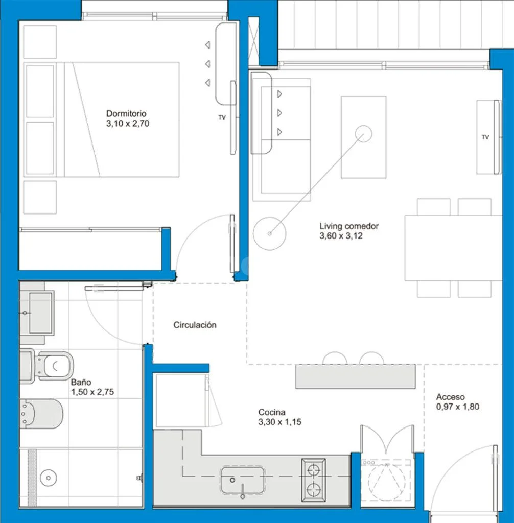 Se desarrolla: Living - comedor con cocina integrada con barra, anafe y horno empotrado. Del living se accede a la terraza balcón con vista a la calle Colombes.