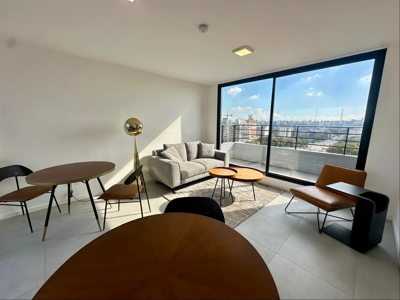 1 dormitorio, cocina integrada, baño con mampara, aire acondicionado, cortinas, luminarias, anafe, horno, campana, calefon y lavarropas. Amueblado a nuevo!! Todo a estrenar!!