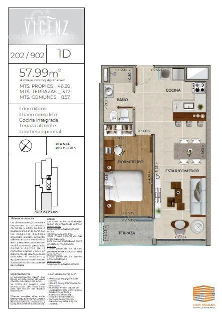 Living comedor con terraza, cocina integrada con placares y equipamiento importado, 1 dormitorio con placard y cortina de enrollar de aluminio, 1 baño. Garaje.