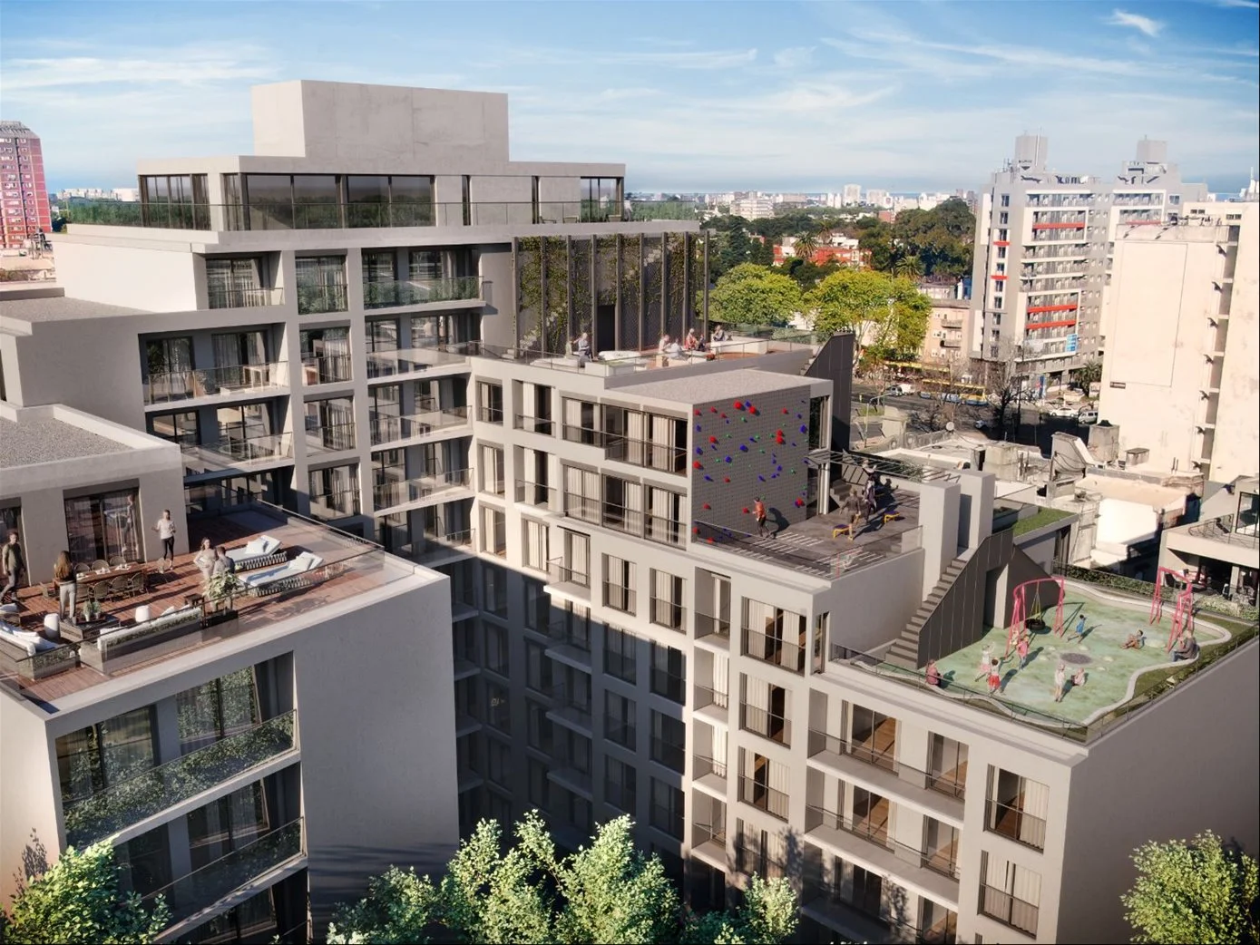 Complejo residencial de 209 apartamentos monoambientes, de 1 y 2 dormitorios, distribuidos en tres edificios con diseño moderno y enfoque sustentable.