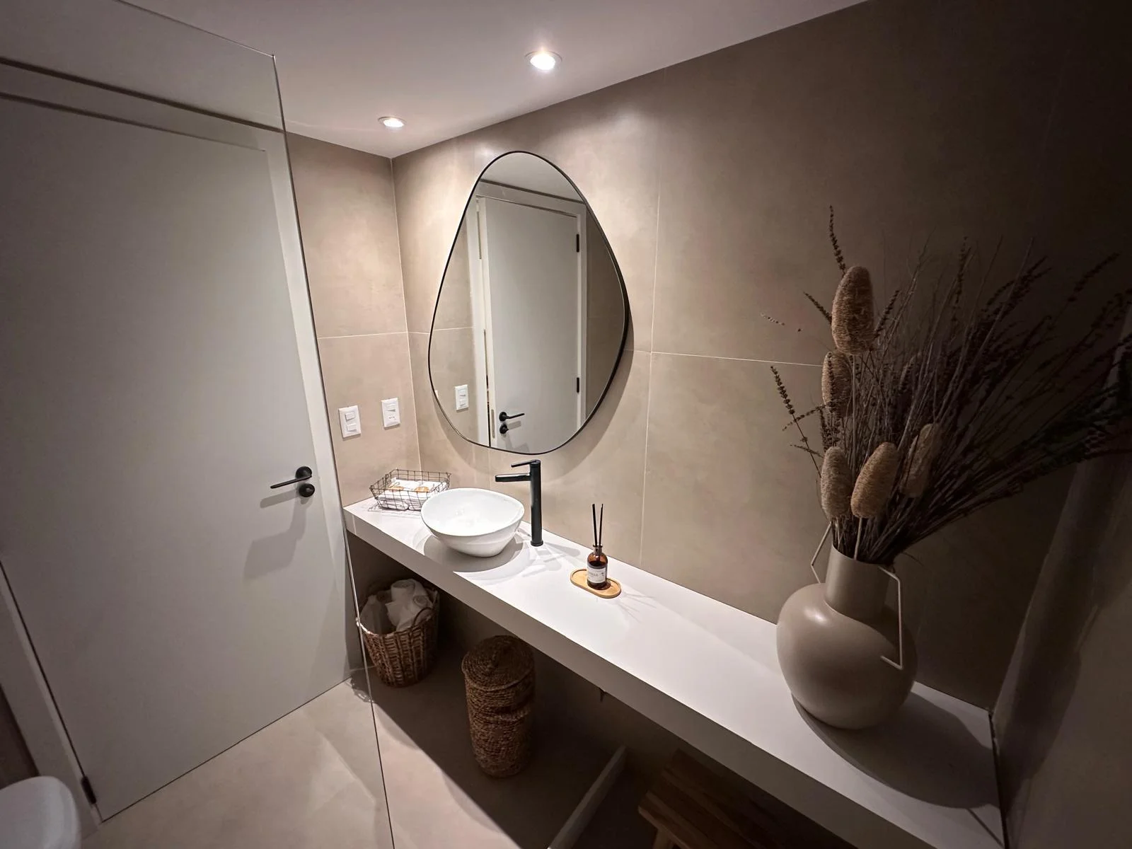 El dormitorio incluye placard en melamina, y la cocina está equipada con muebles bajo mesada modulares, mesada de granito, pileta de acero inoxidable y grifería de calidad.