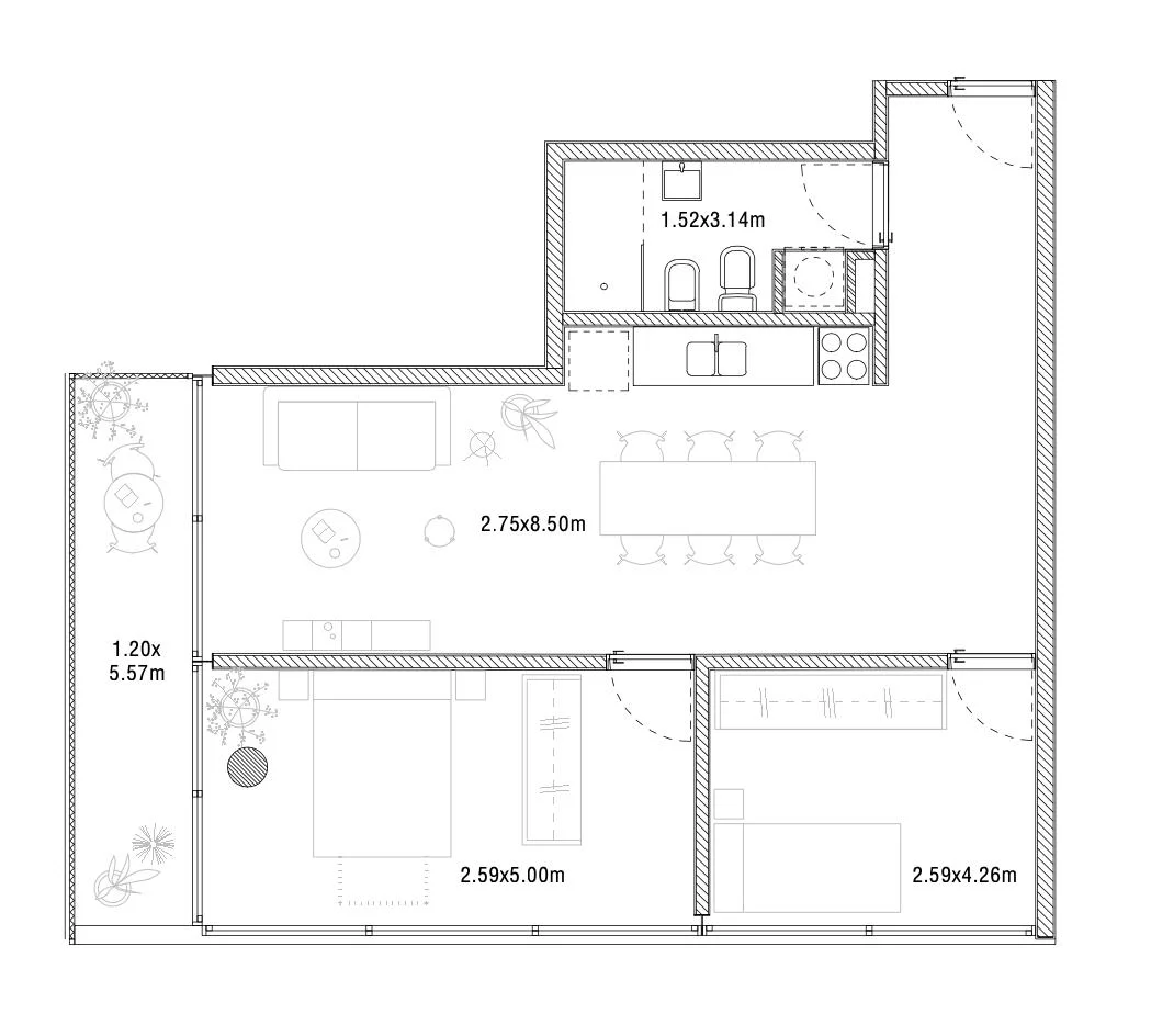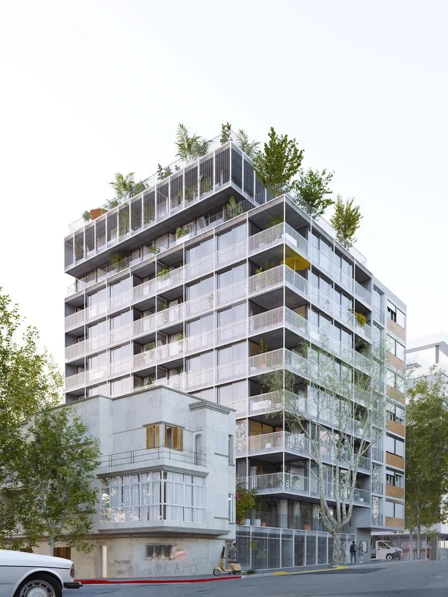 A través de un sistema circulatorio de pasarelas que ventilan a un patio interior se organizan 39 unidades tipo monoambiente, 1, 2 y 3 dormitorios.