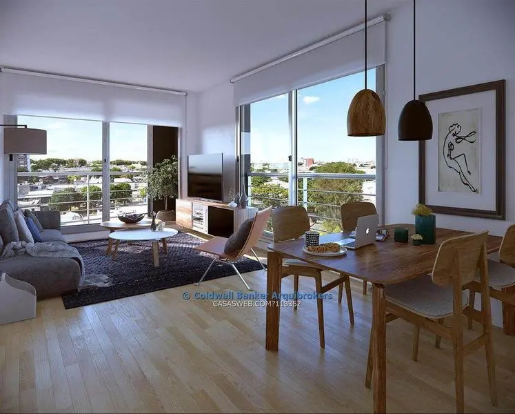 Living comedor con salida a terraza y cocina integrada, 2 dormitorios y 1 baño.