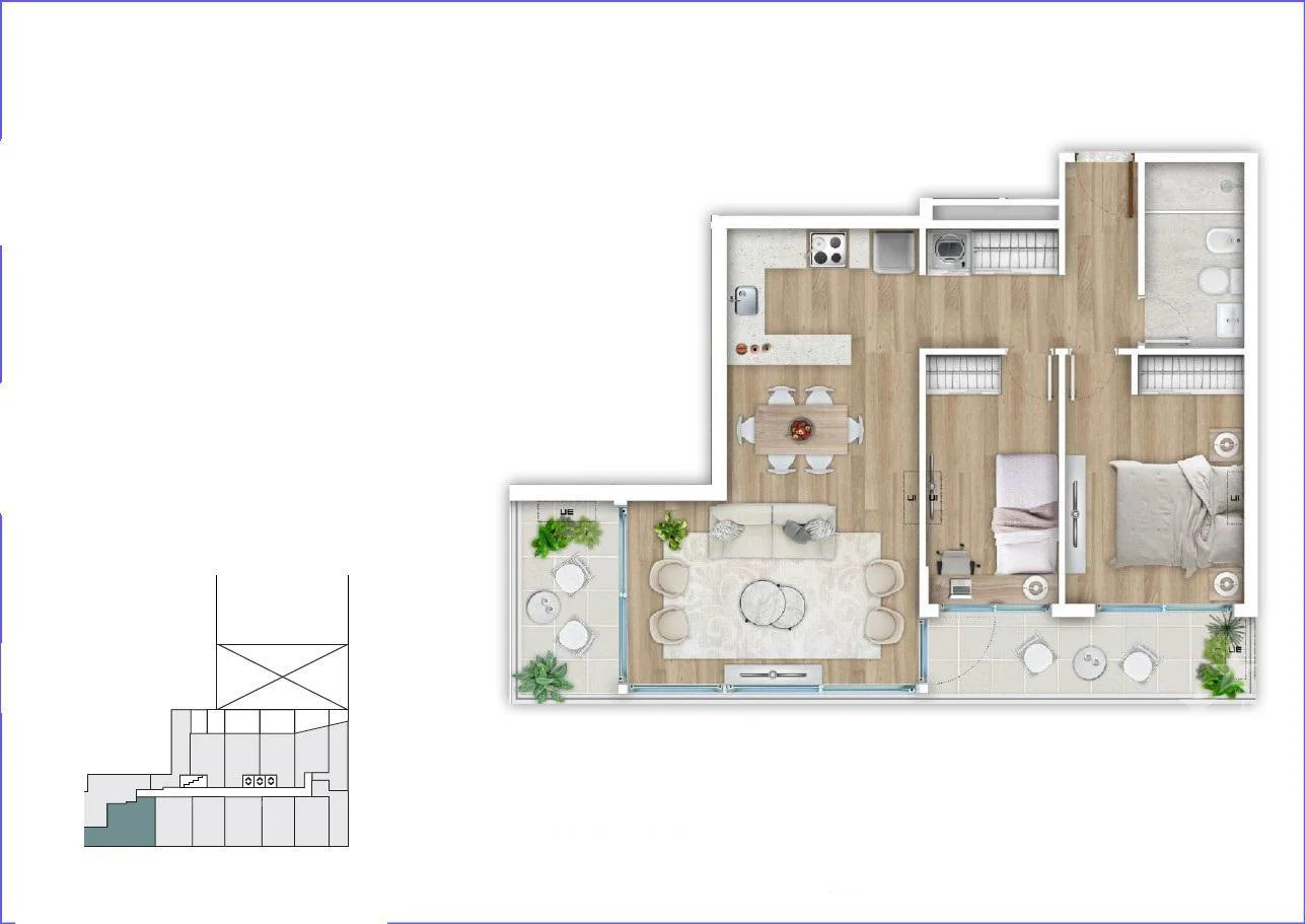Apartamento en esquina. Living comedor con terraza al frente en esquina, cocina integrada con placares, 2 dormitorios con terraza sobre Canelones, 1 baño.