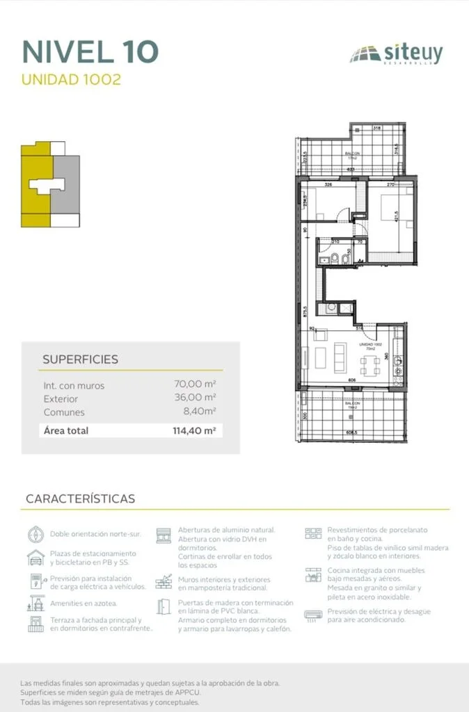 El edificio contará con 11 pisos, con apartamentos de 1 y 2 dormitorios, todos con excelente orientación, terrazas o patios de uso exclusivo. En planta baja dispondrá de 20 cocheras.