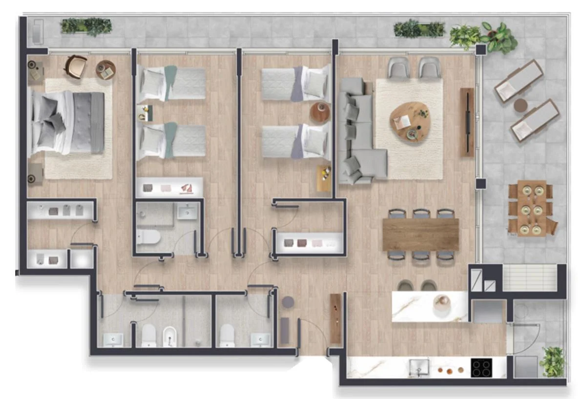Novus Parques, esta proyectado con 4 torres desarrolladas en distintas etapas, la primera de 4 pisos con apartamentos de 2, 3 y 4 dormitorios con parrillero propio.