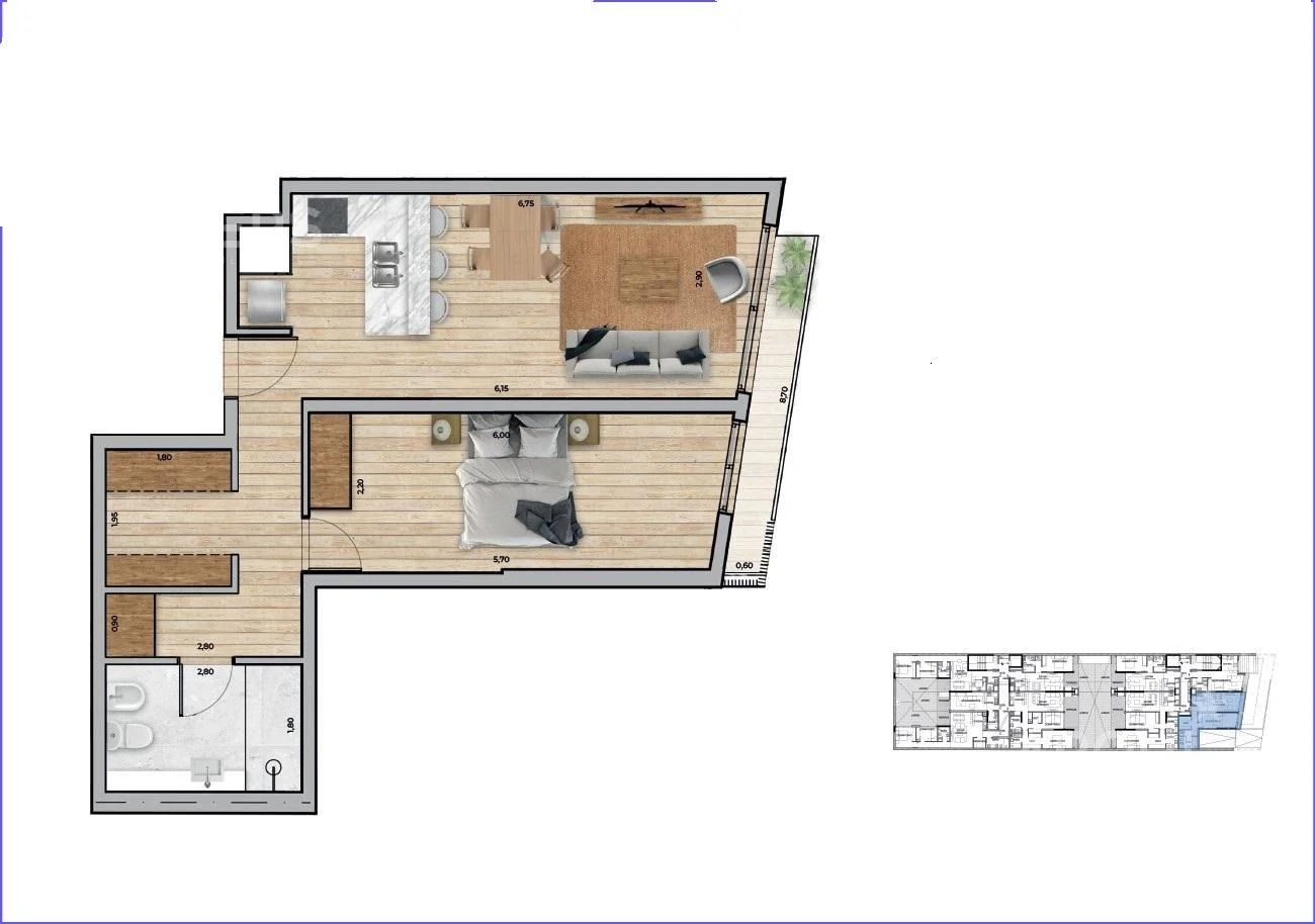 Living comedor con terraza, cocina integrada con placares, campana, horno eléctrico y anafe, 1 dormitorio, vestidor, 1 baño completo con extractor.