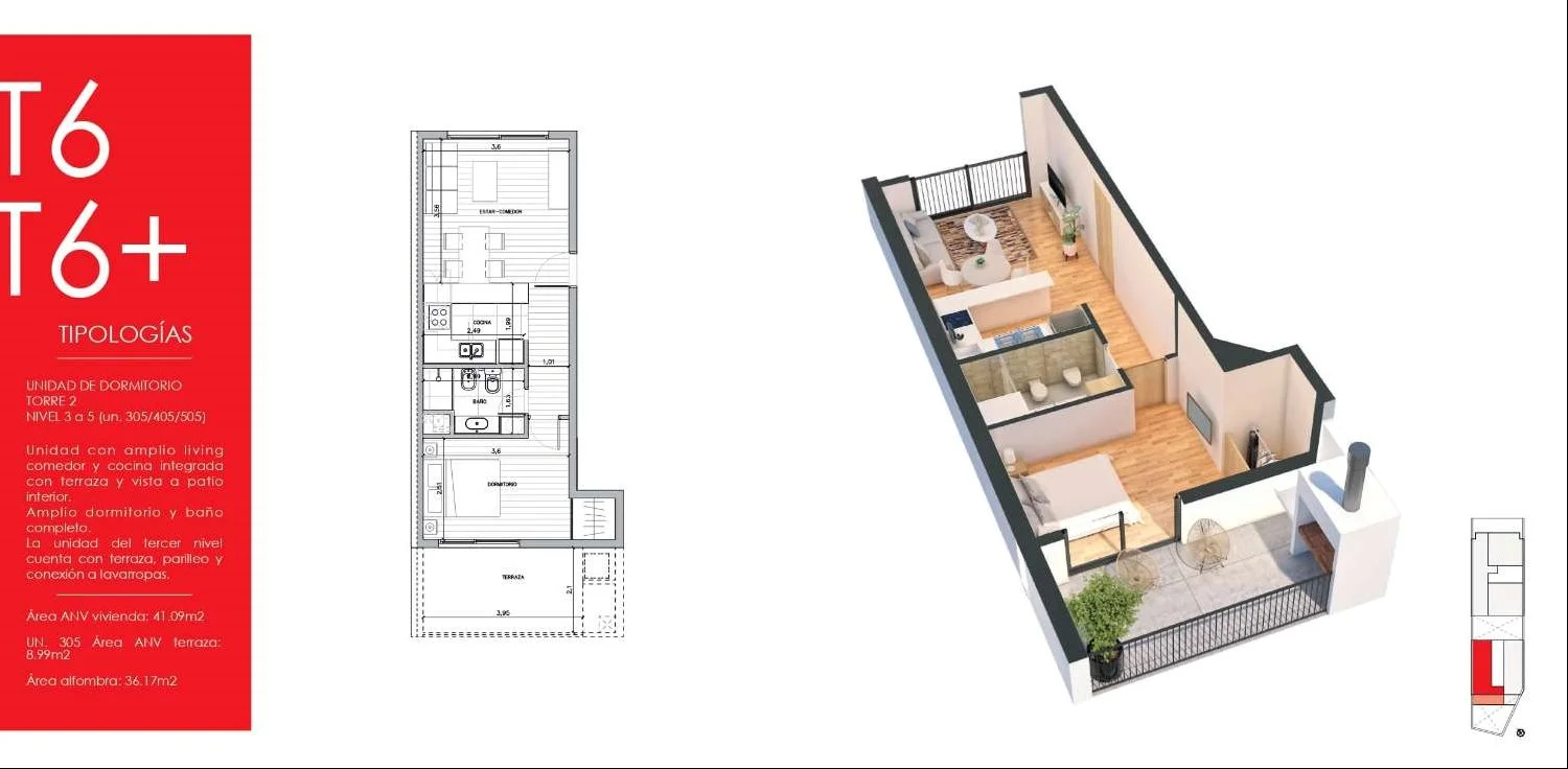 Edificio de 6 pisos. Apartamentos monoambientes, de 1 y de 2 dormitorios. Consta de 2 torres, ascensores desde los garajes hasta el 6to piso donde se encuentran los amenities.