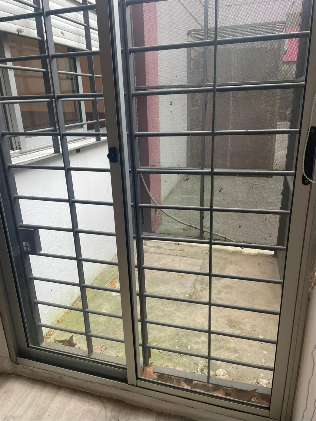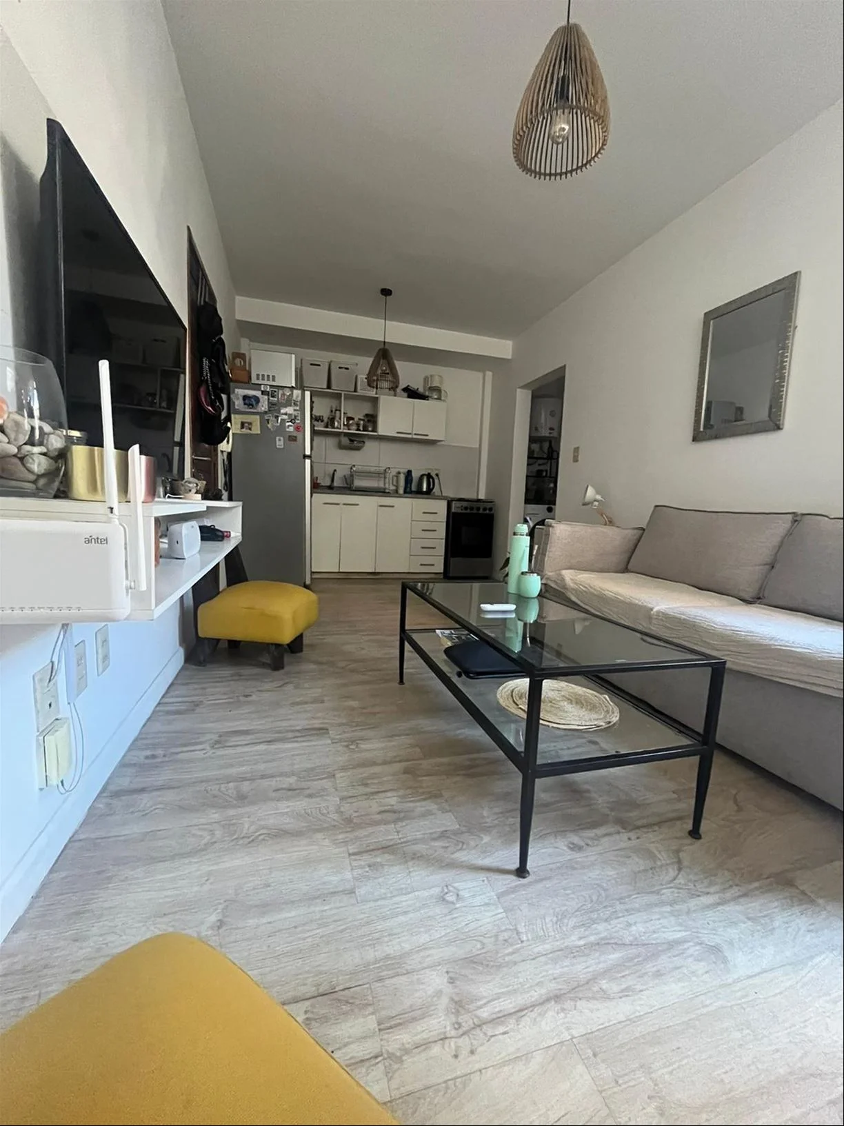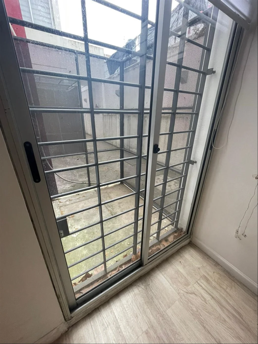 Living-comedor con cocina integrada, puerta de vidrio con salida al patio.