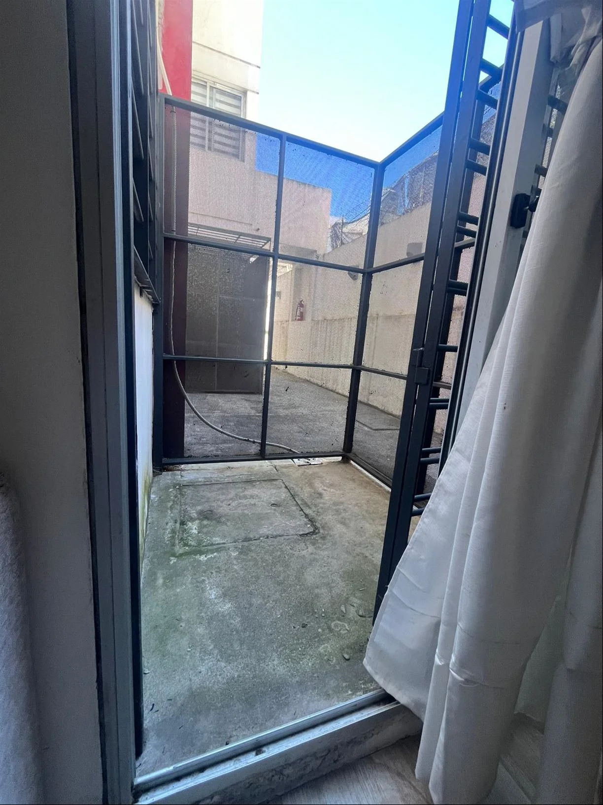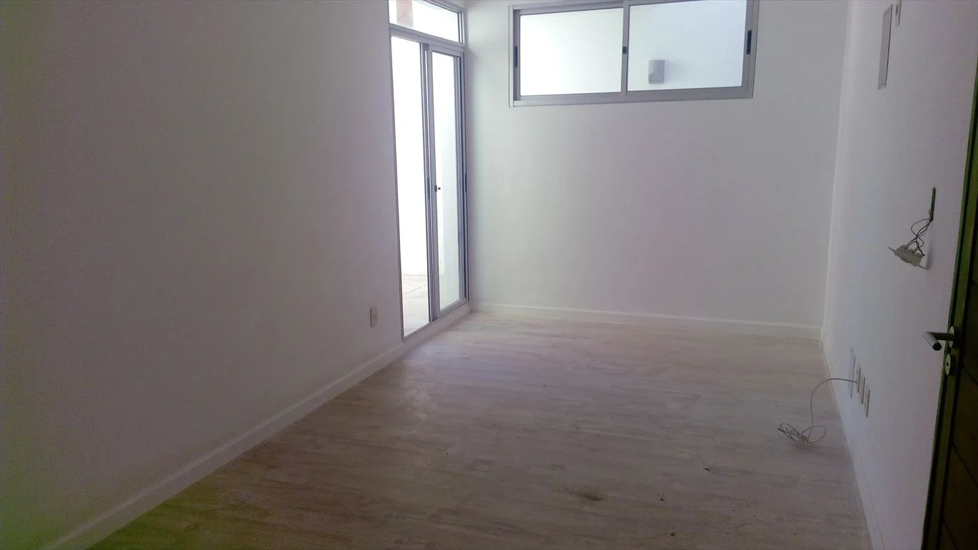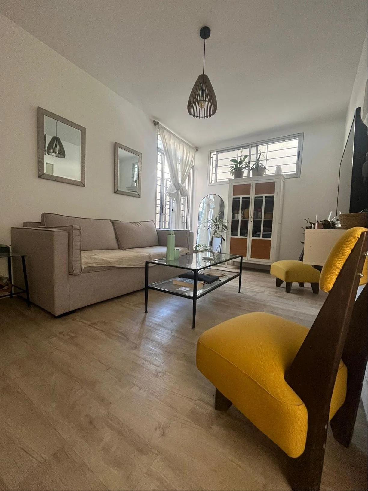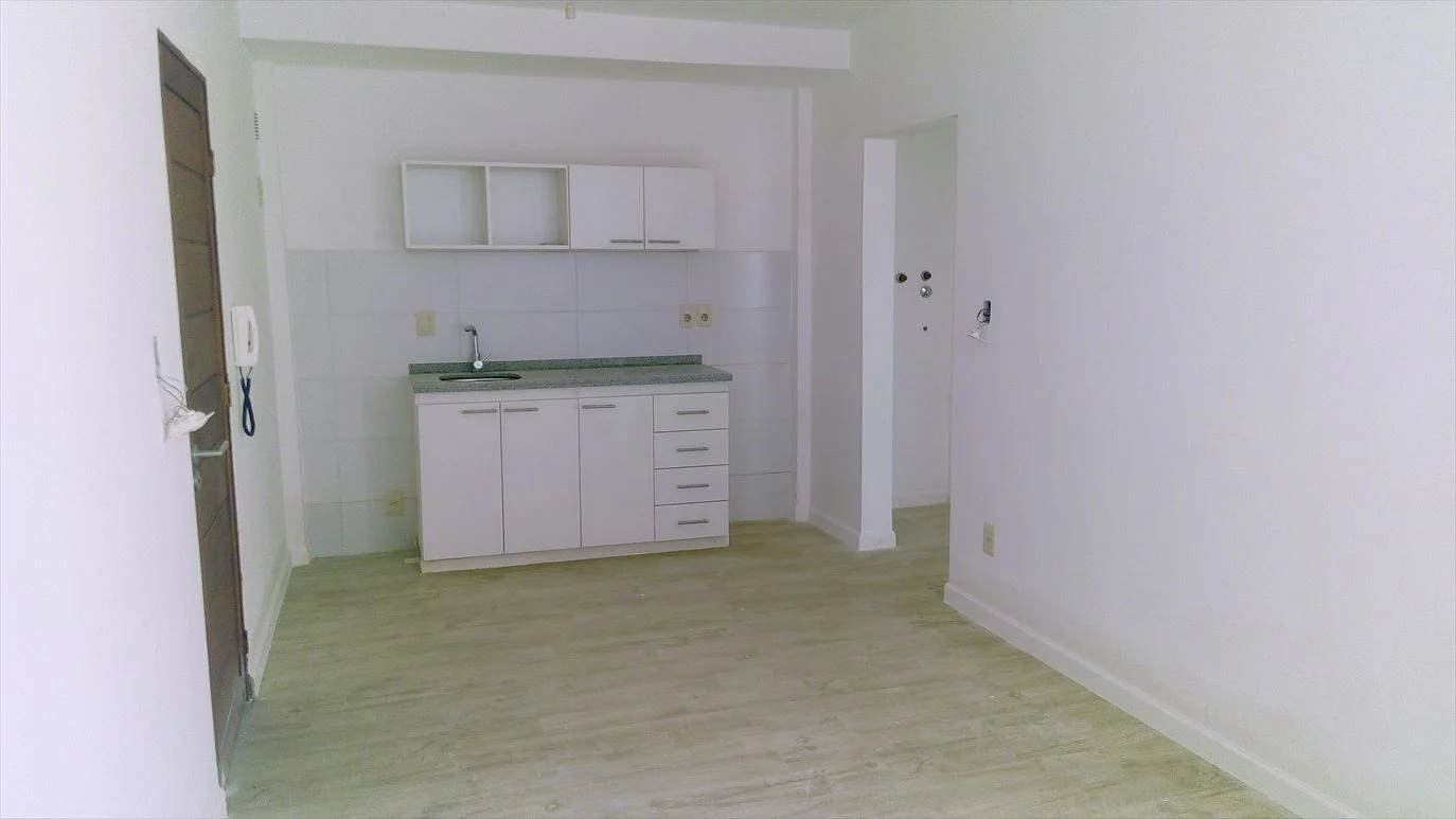 Living-comedor con cocina integrada, puerta de vidrio con salida al patio.