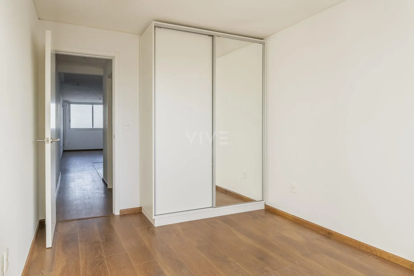 Un dormitorio con salida a balcón. Equipado con placard de puertas corredizas espejadas.