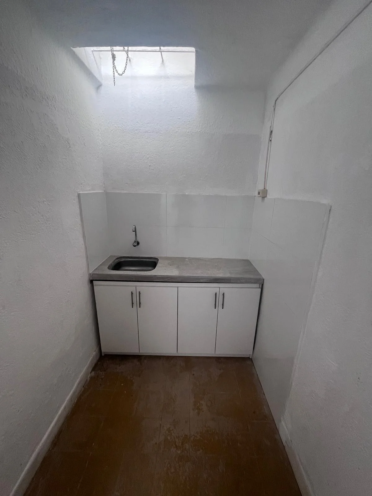 Cocina pequeña, baño con instalación de lavarropas y patio de uso comun para colgar ropa.