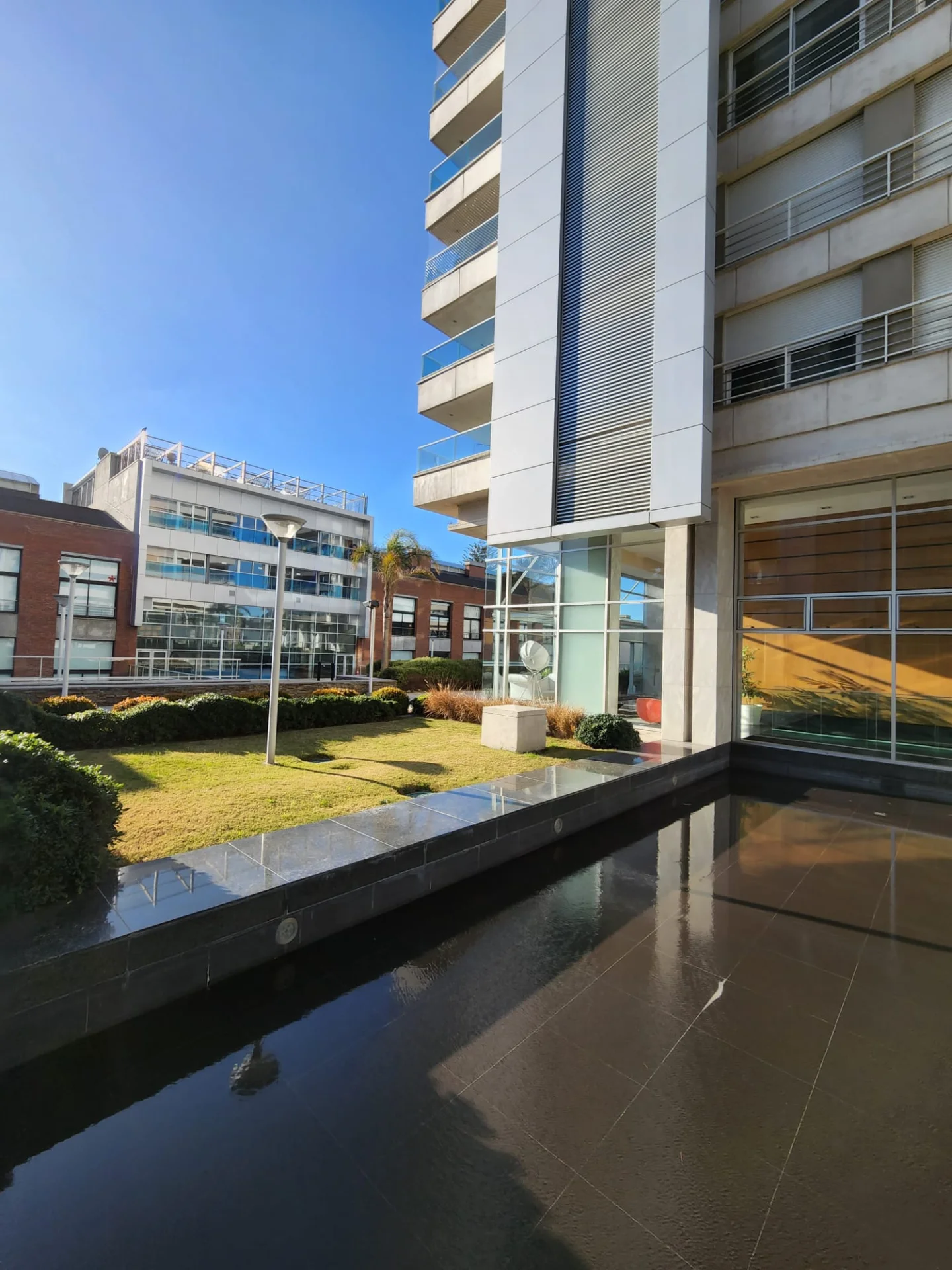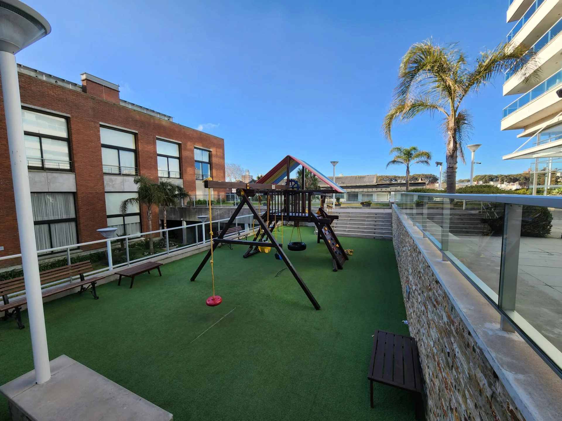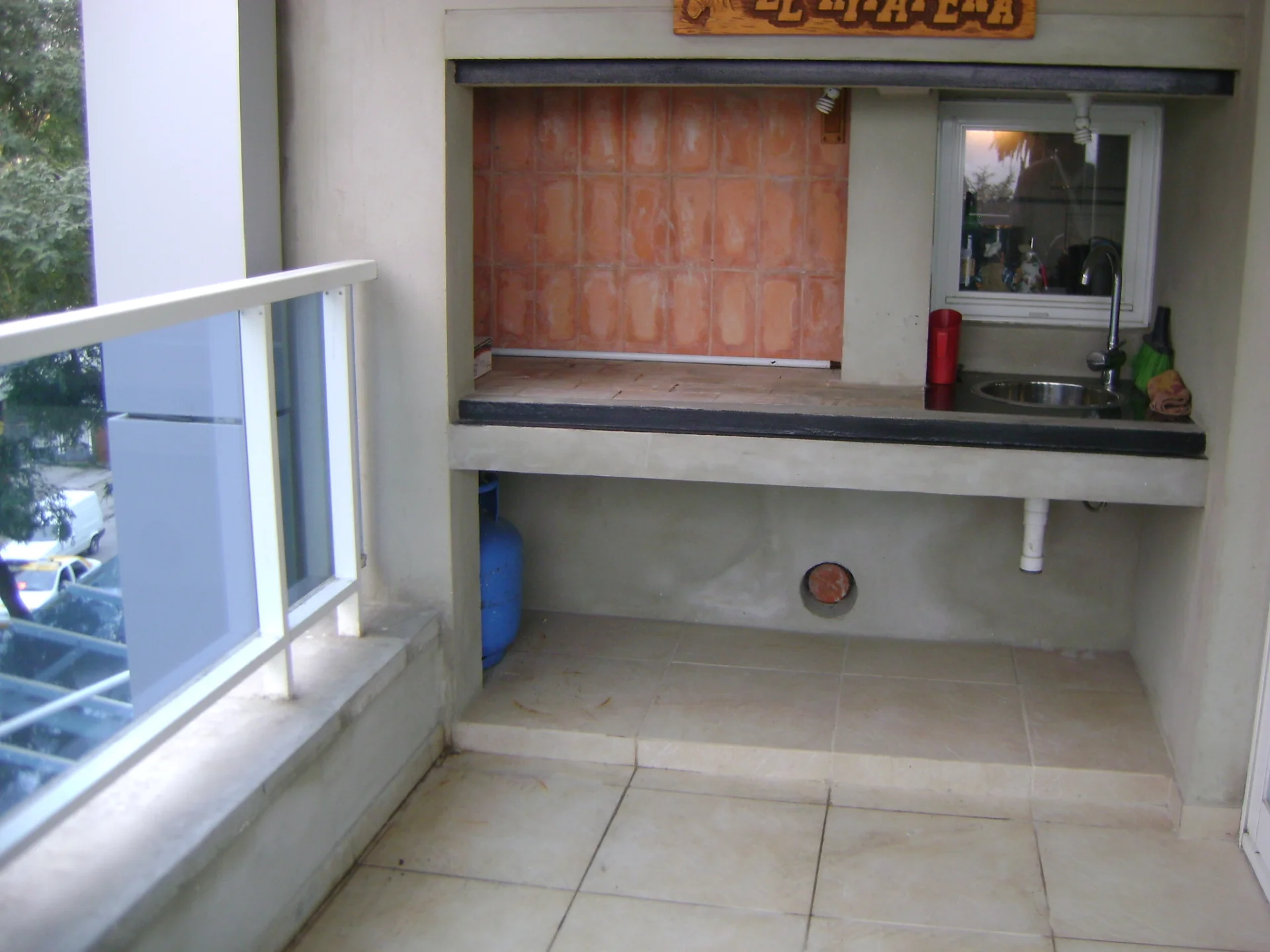 Cuenta con dos dormitorios, siendo el principal en suite, y dos baños con revestimientos modernos. La cocina está equipada con línea blanca, anafe, horno, campana y caldera a gas. Dispone de terraza con parrillero, conectada directamente con la cocina.