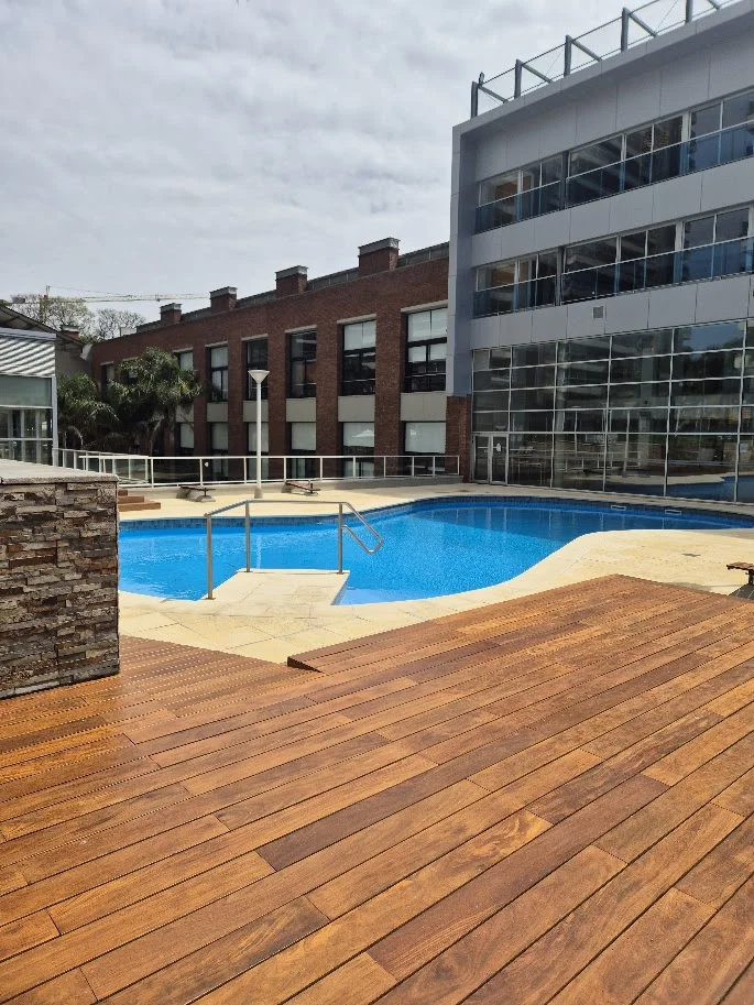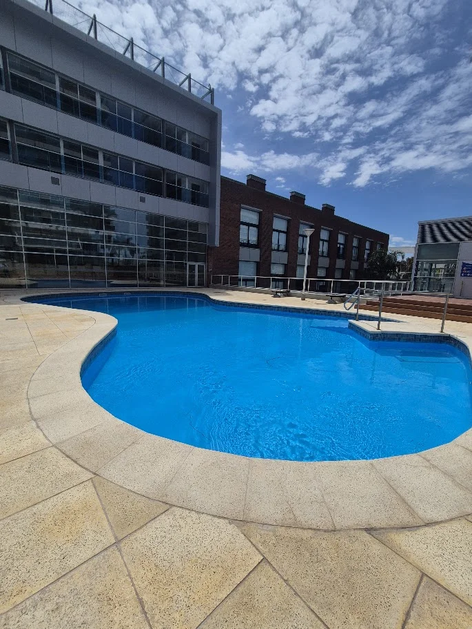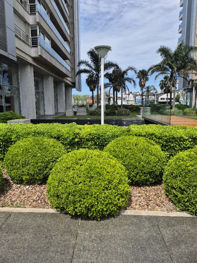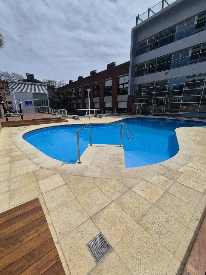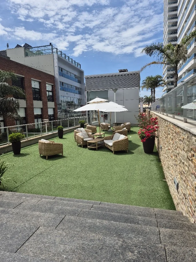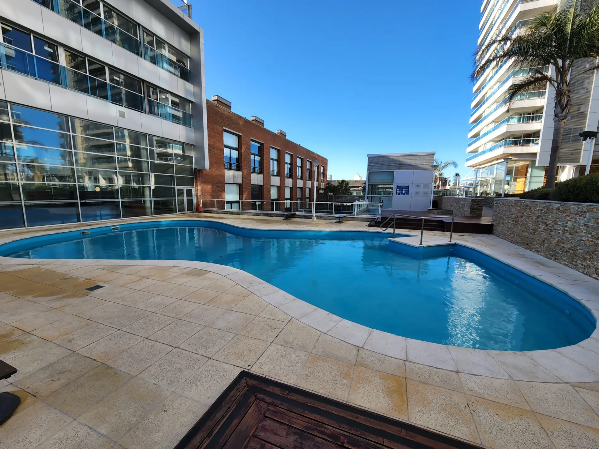 Cuenta con dos dormitorios, siendo el principal en suite, y dos baños con revestimientos modernos. La cocina está equipada con línea blanca, anafe, horno, campana y caldera a gas. Dispone de terraza con parrillero, conectada directamente con la cocina.