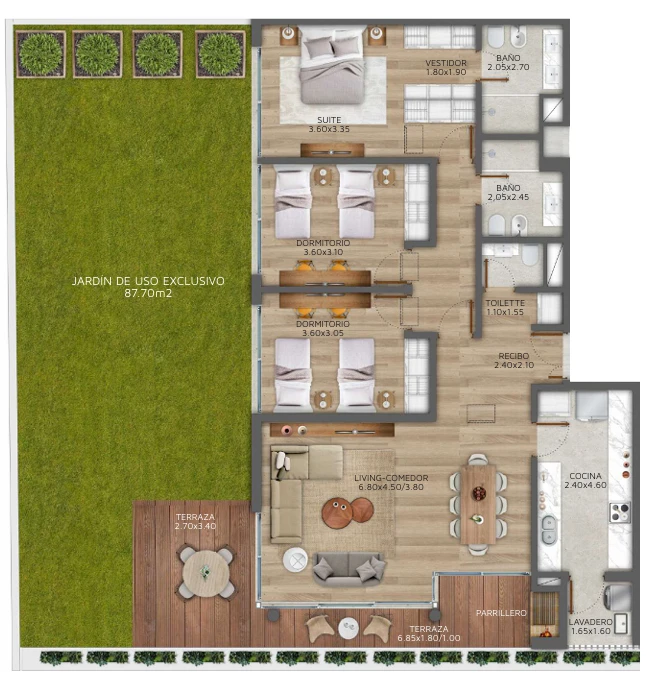 Metraje: 129m2 cubiertos + 27m2 de terraza + 88m2 de jardin
