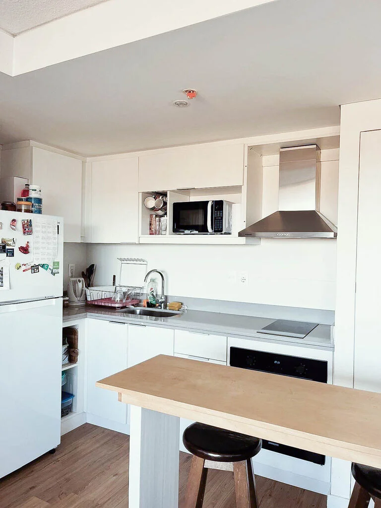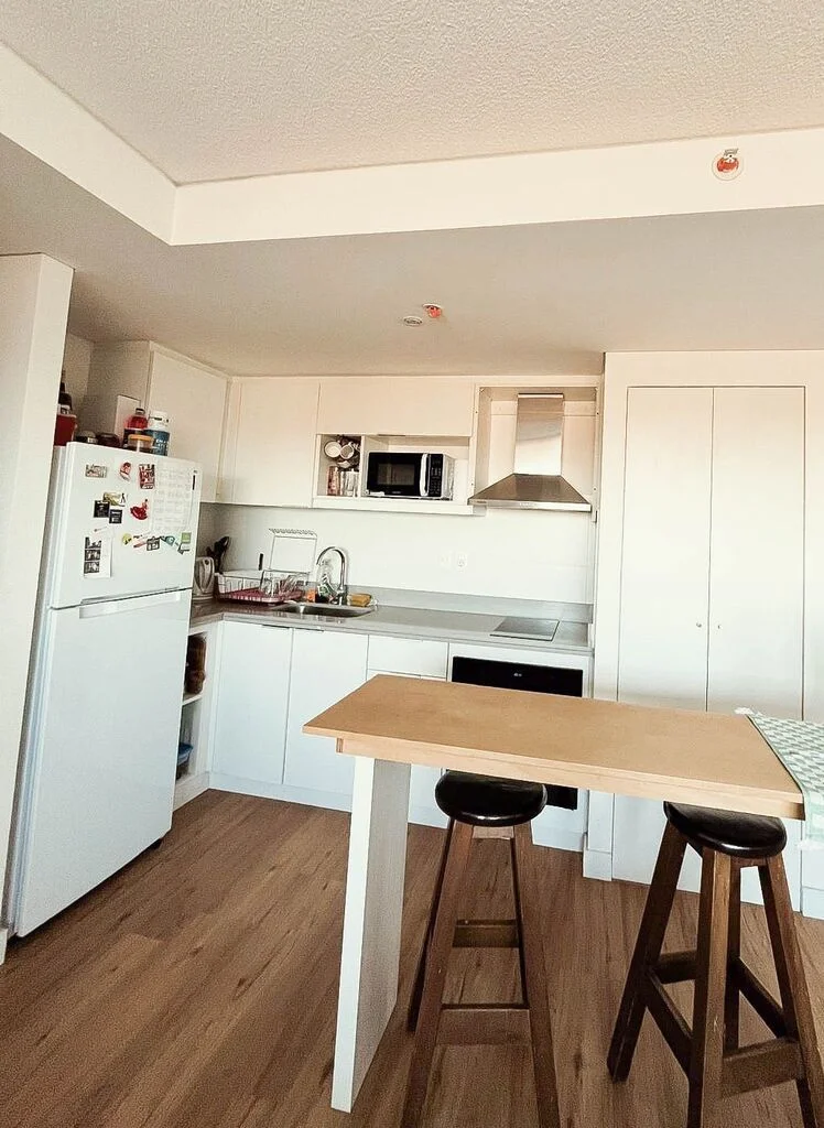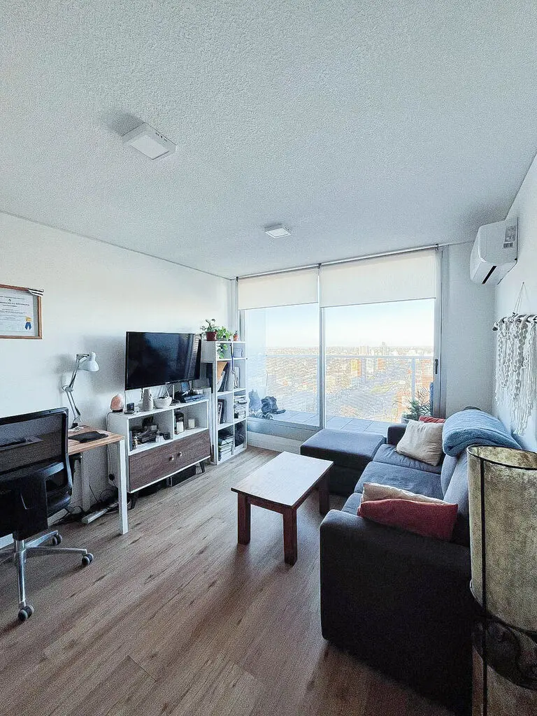 Living comedor con salida a la terraza de 5m2, cocina integrada con barra, placar con instalación para lavarropas y calefón, un dormitorio con placar y un baño completo.