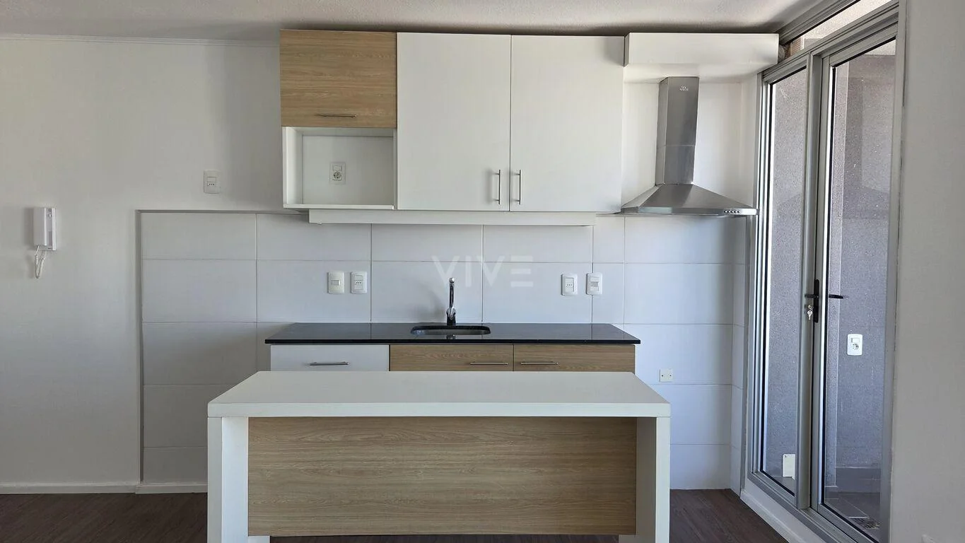 Cocina integrada con placares bajo mesada y aéreos, barra desayunadora y campana de extracción.