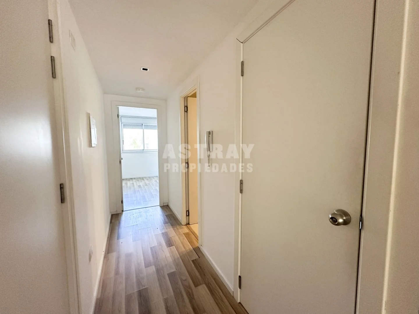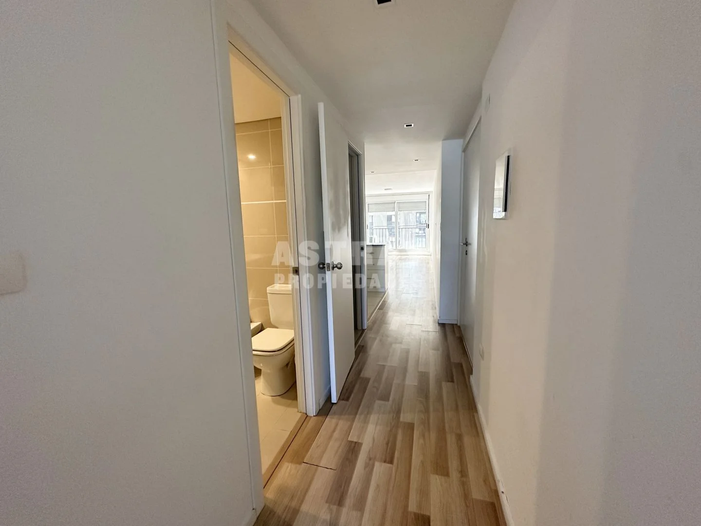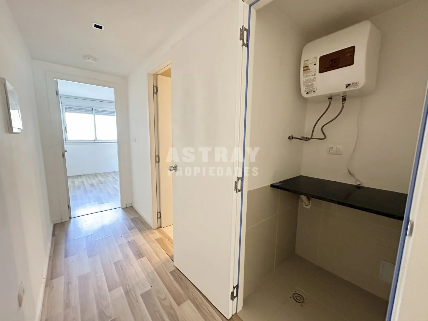 Prolijo placard en pasillo con conexión para lavarropa.