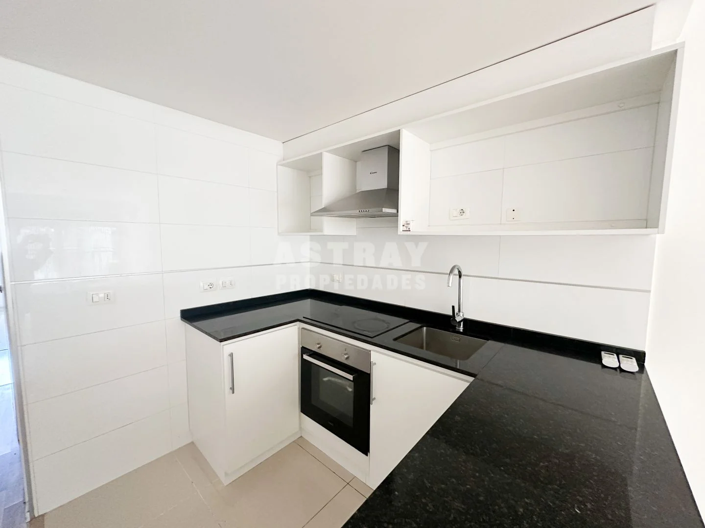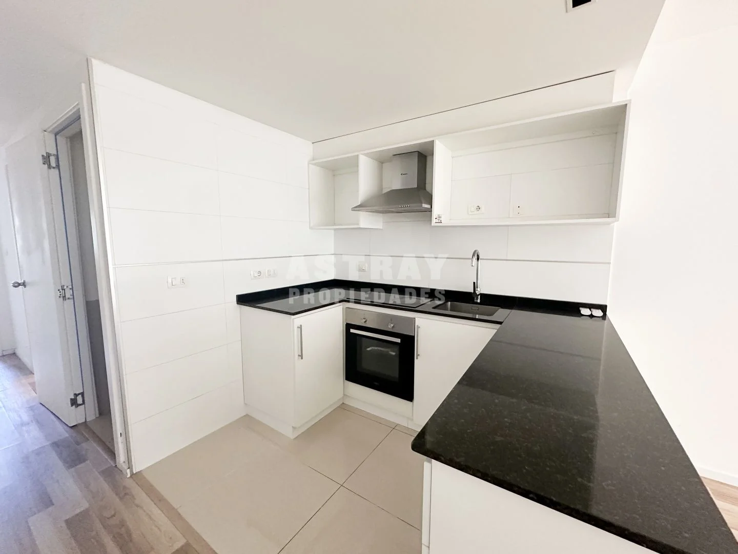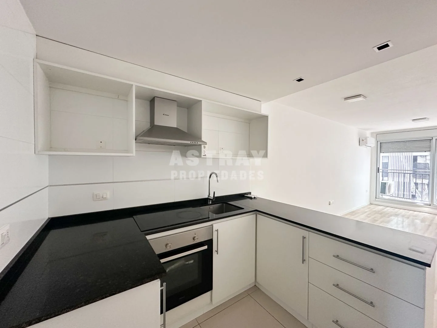 Cocina semi integrada en forma de U, con placares aéreos y bajo mesada.