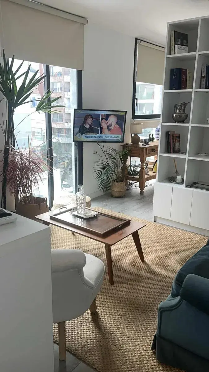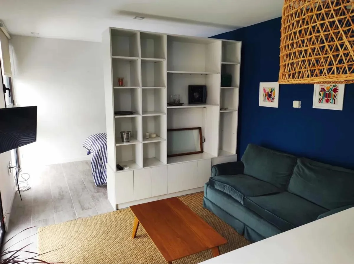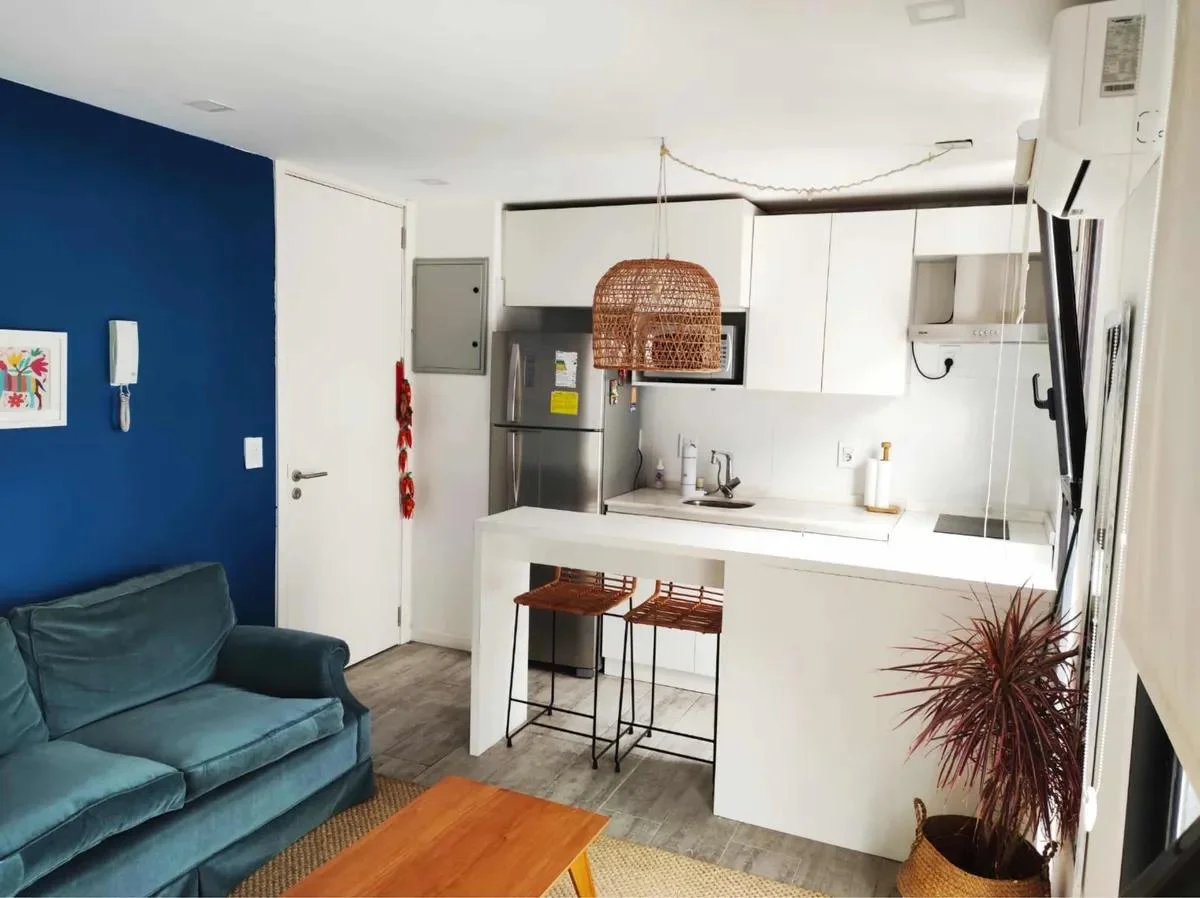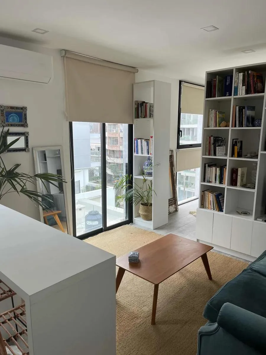 Dispone de cocina con isla y butacas de ratán, heladera, horno empotrado, anafe, microondas y calefón. Área de descanso con sommier de plaza y media, mesa de luz, vestidor y baño completo con luz natural. En el living se integra una amplia biblioteca divisoria, sillón de dos cuerpos, mesa ratona, alfombra de fibra color crudo y TV visible desde ambos ambientes.