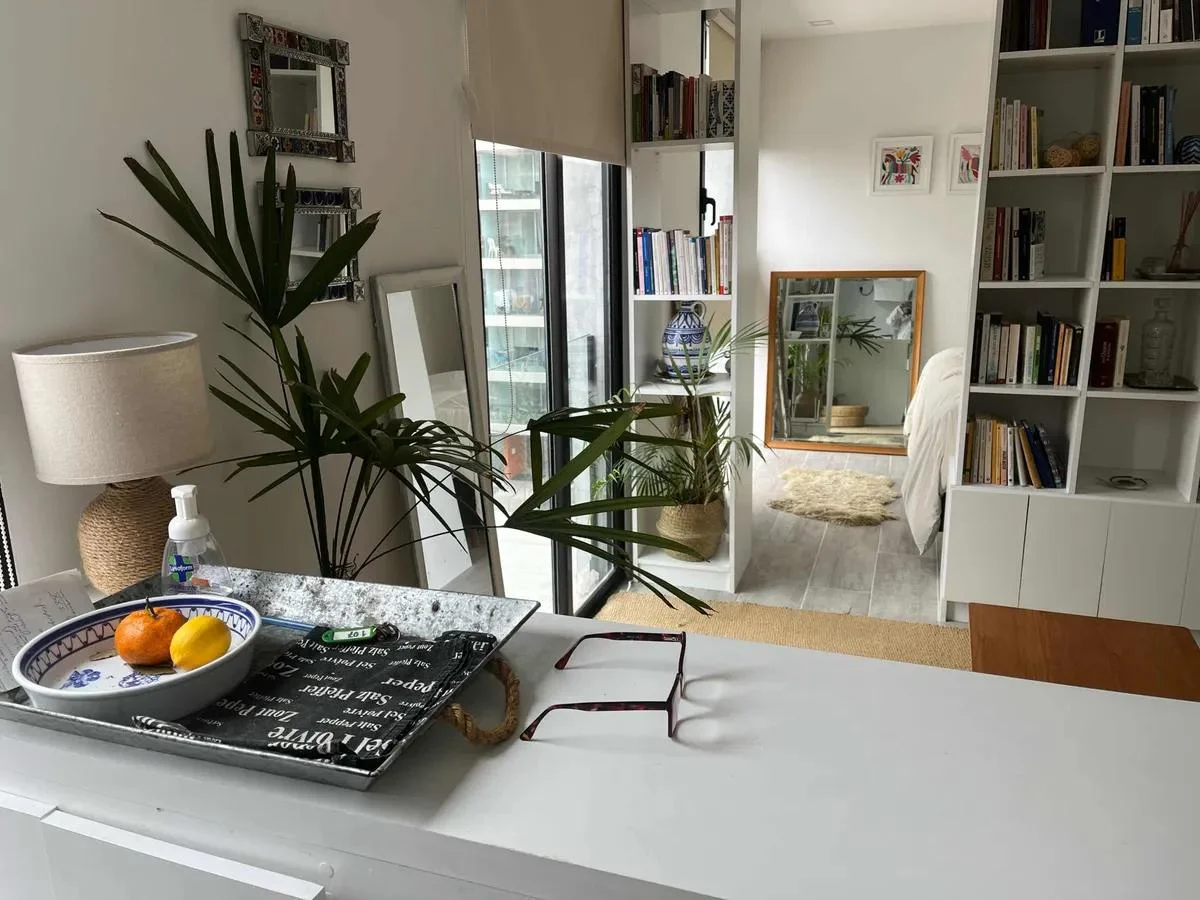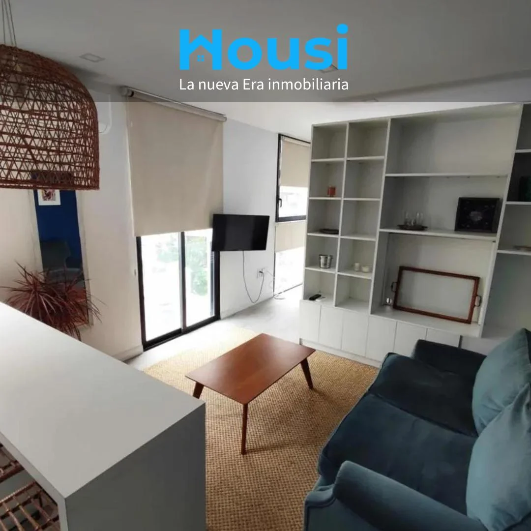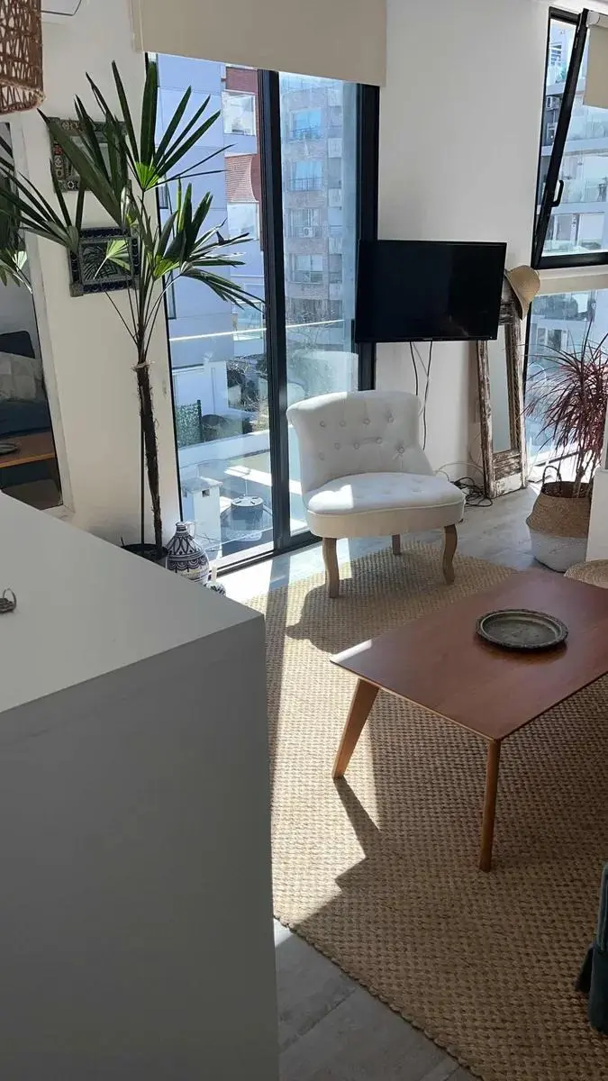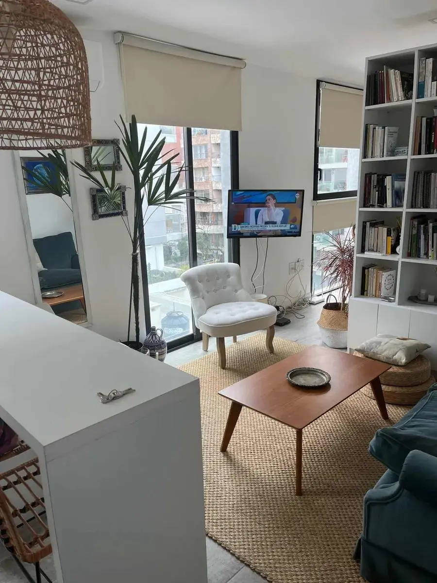 Dispone de cocina con isla y butacas de ratán, heladera, horno empotrado, anafe, microondas y calefón. Área de descanso con sommier de plaza y media, mesa de luz, vestidor y baño completo con luz natural. En el living se integra una amplia biblioteca divisoria, sillón de dos cuerpos, mesa ratona, alfombra de fibra color crudo y TV visible desde ambos ambientes.