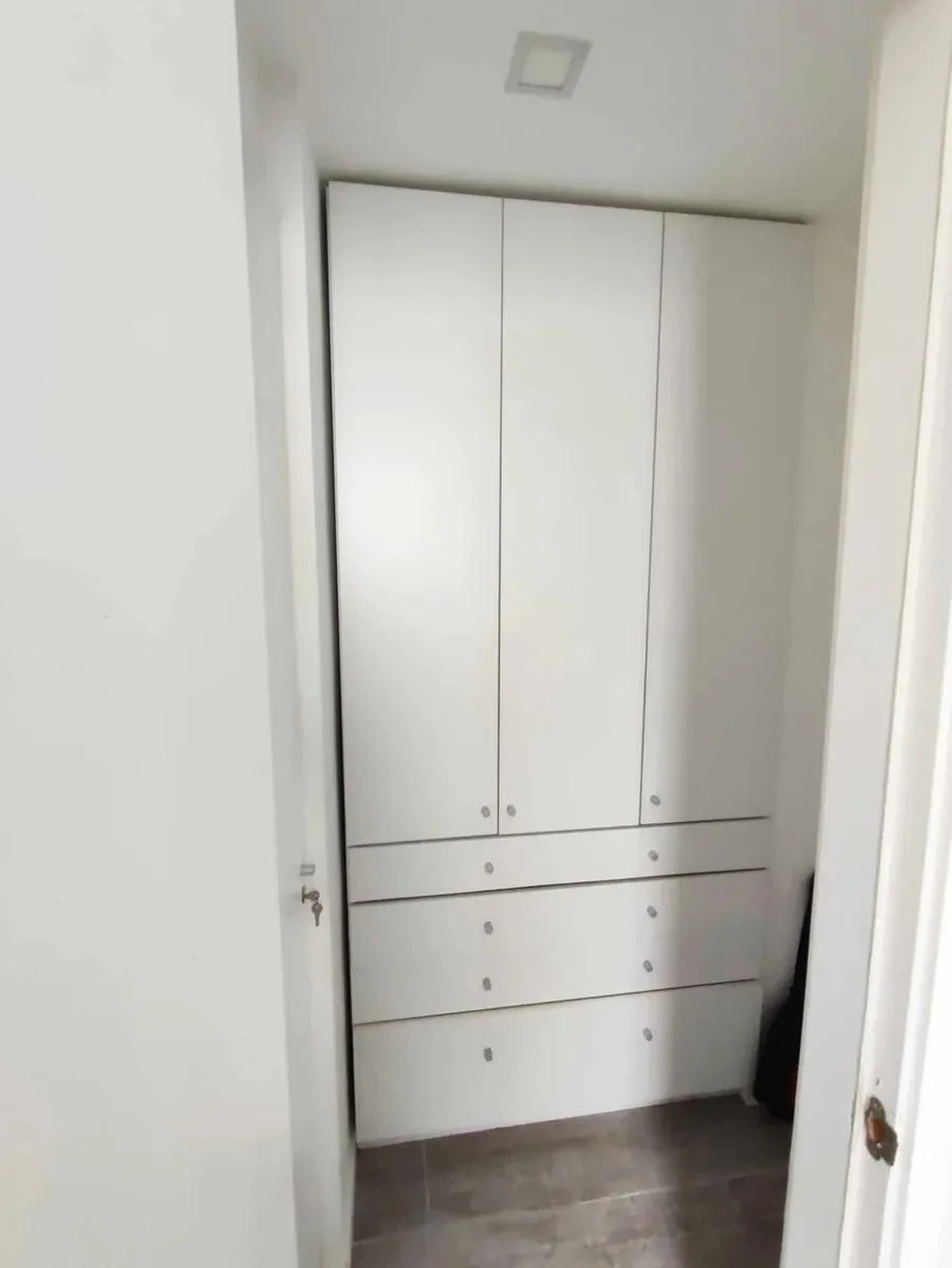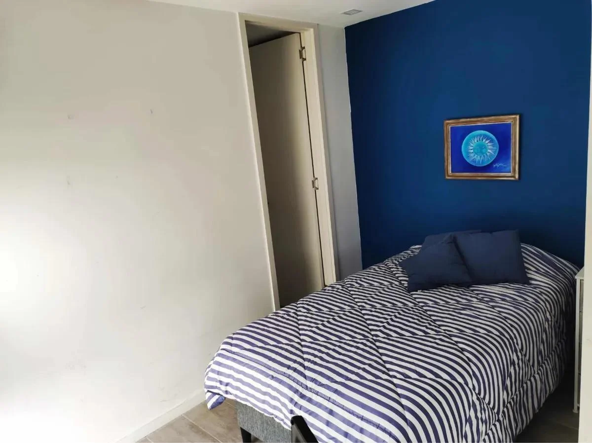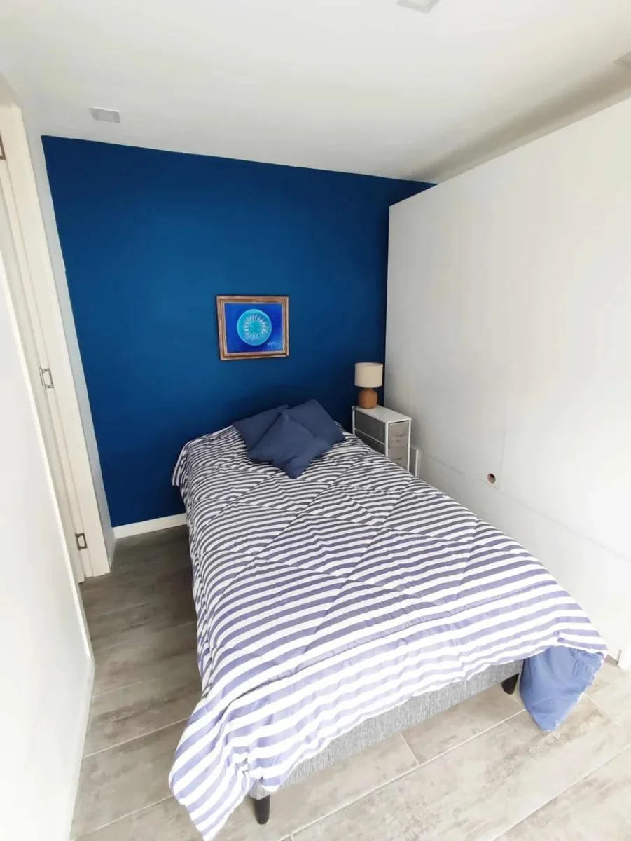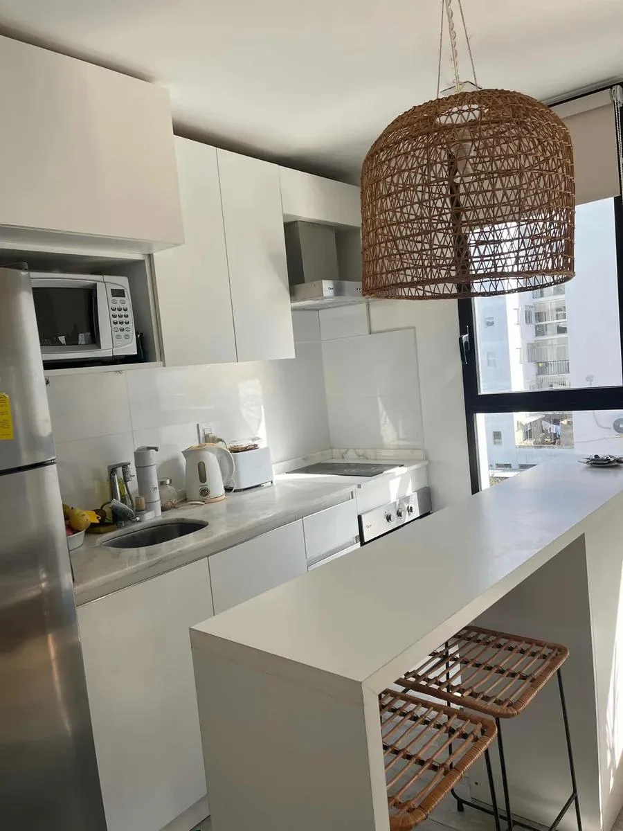 Dispone de cocina con isla y butacas de ratán, heladera, horno empotrado, anafe, microondas y calefón. Área de descanso con sommier de plaza y media, mesa de luz, vestidor y baño completo con luz natural. En el living se integra una amplia biblioteca divisoria, sillón de dos cuerpos, mesa ratona, alfombra de fibra color crudo y TV visible desde ambos ambientes.