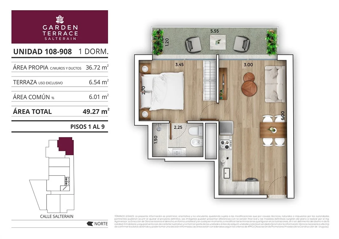 El apartamento está en el piso 6 de un edificio nuevo, tiene un living comedor muy cómodo con cocina integrada con buena mesada.
