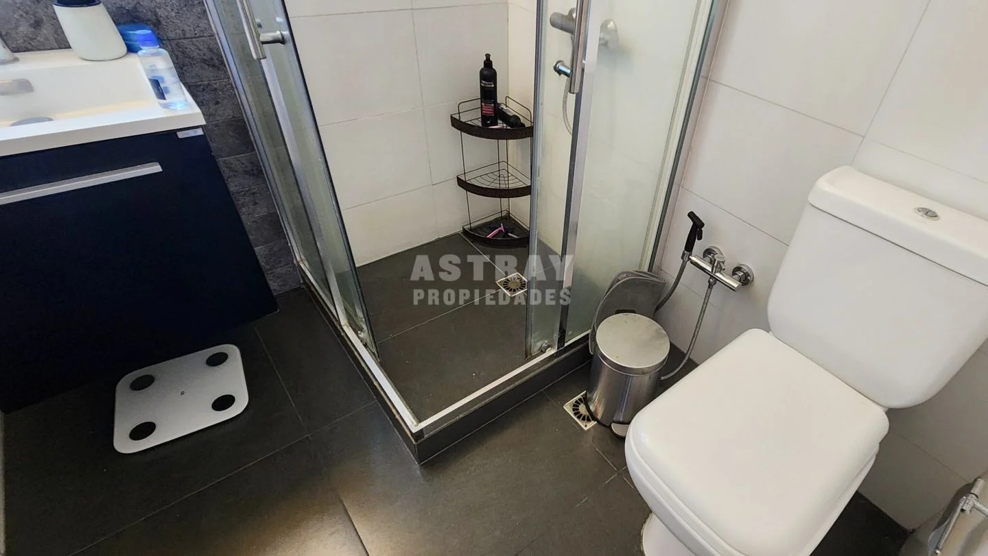 Baño completo con mampara y mueble auxiliar, equipado con calefón de 30L.