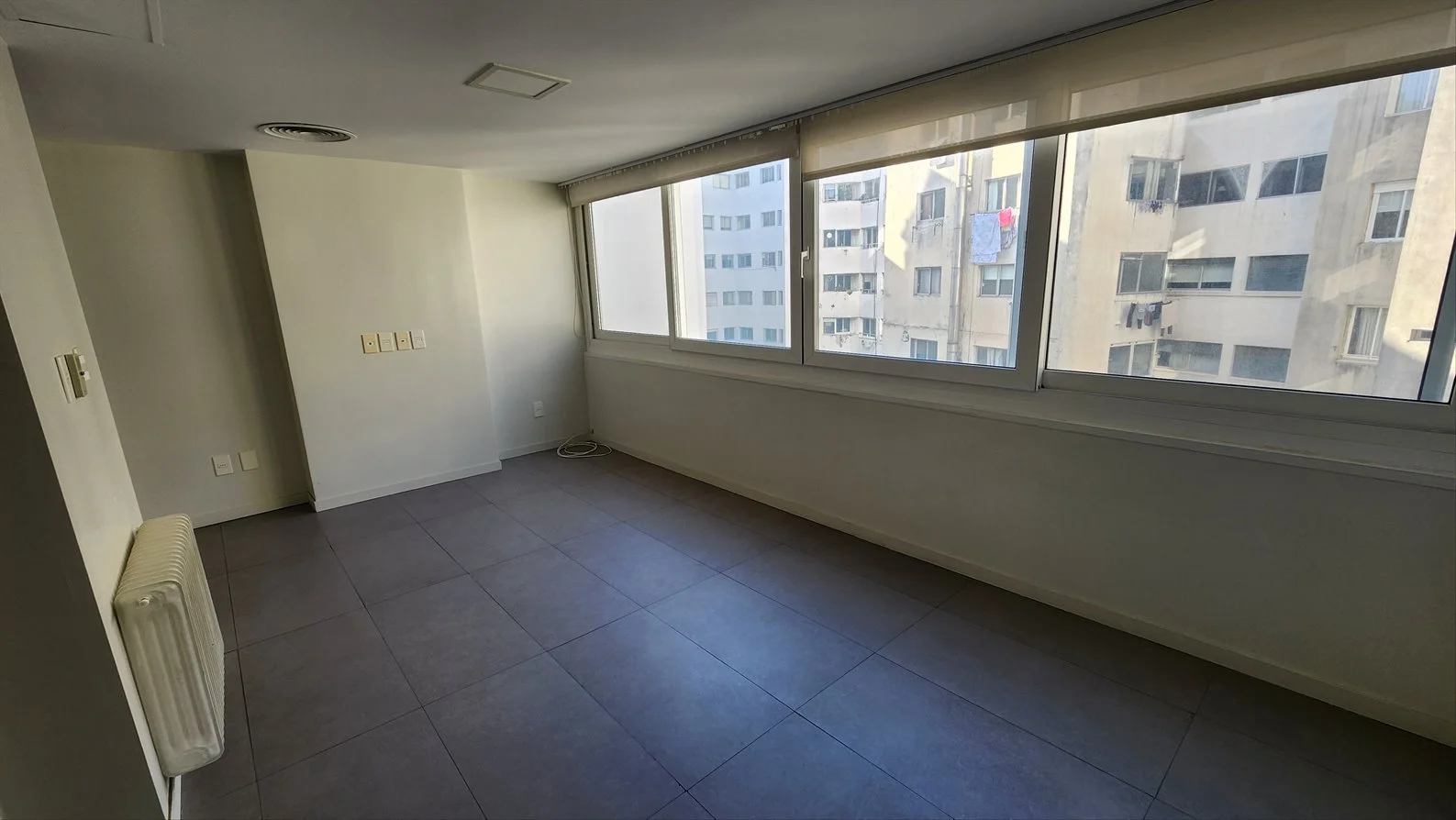 Living muy luminoso con salida a muy amplia terraza al frente. Vista totalmente despejada a la plaza.