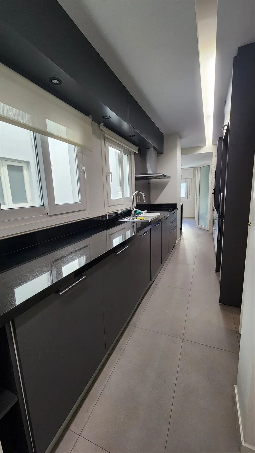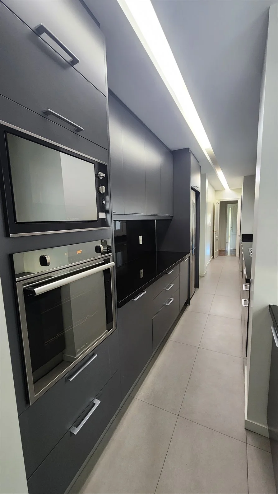 Cocina de muy buen tamaño con grandes mesadas de mármol negro. Los placares son marca Johnson Acero. Horno, anafe, campana, microondas, heladera , lavavajillas, lavarropa y secarropa de la linea Ariston.