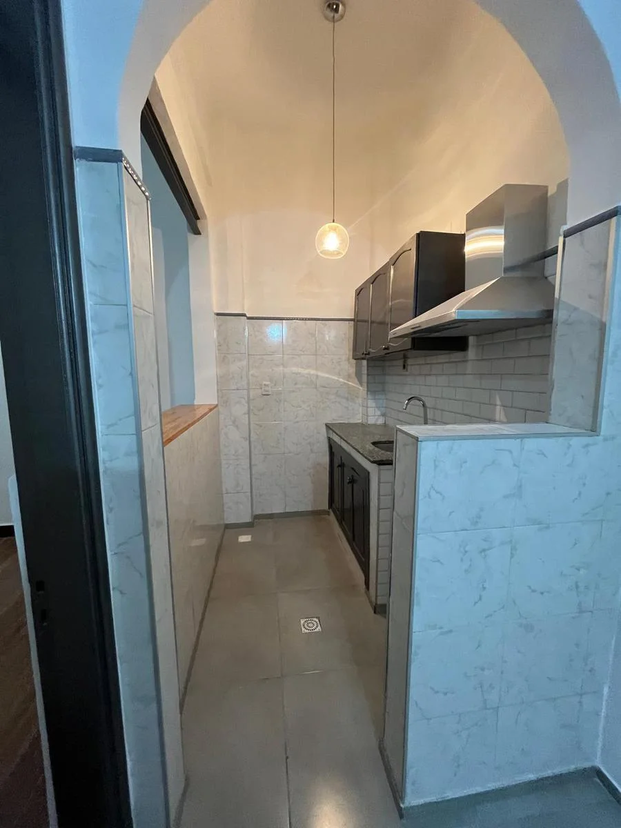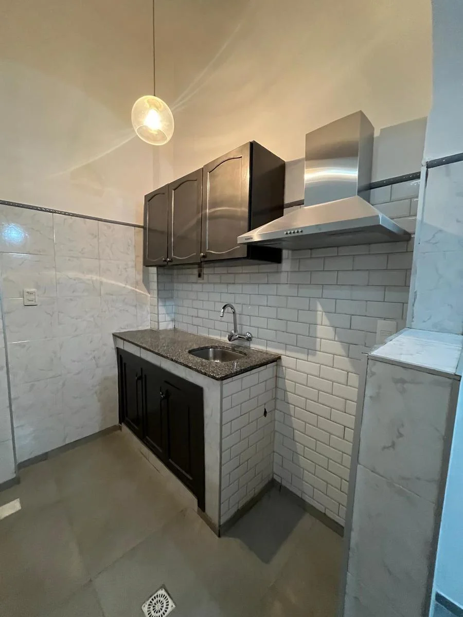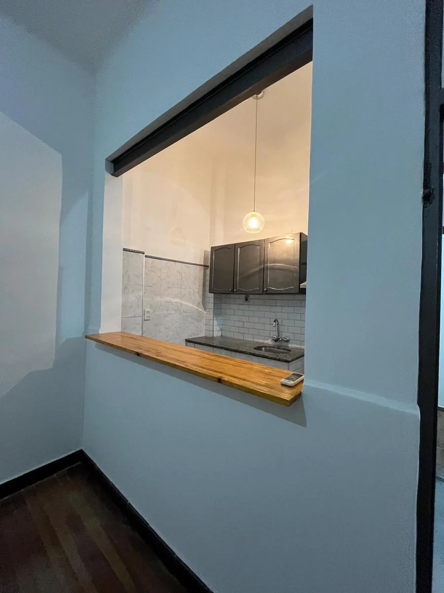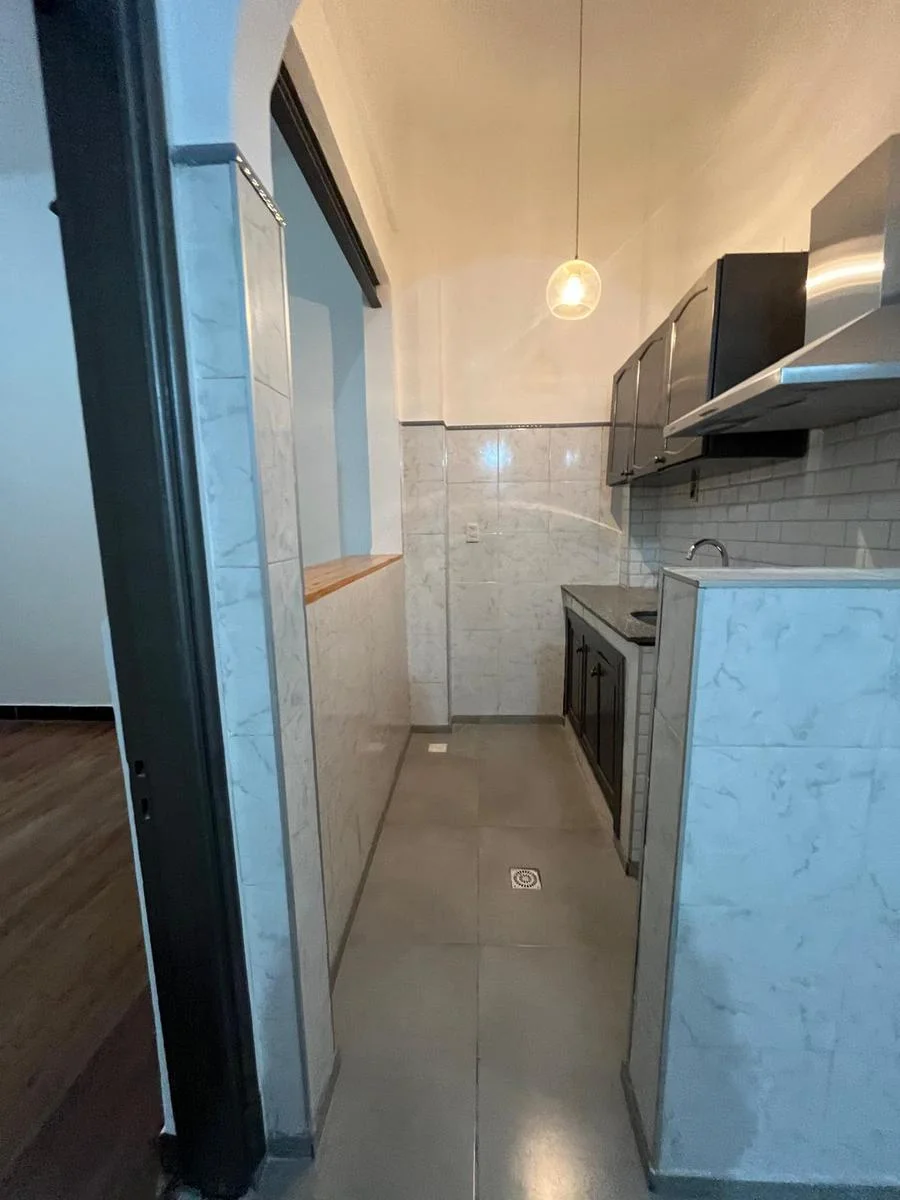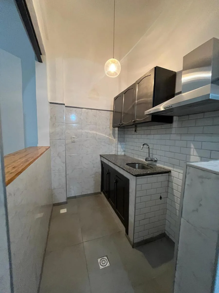 Living comer amplio con cocina integrada, toda hecha a nueva, que cuenta con una barra desayunadora, almacenamiento sobre y bajo mesada y campana extractora.