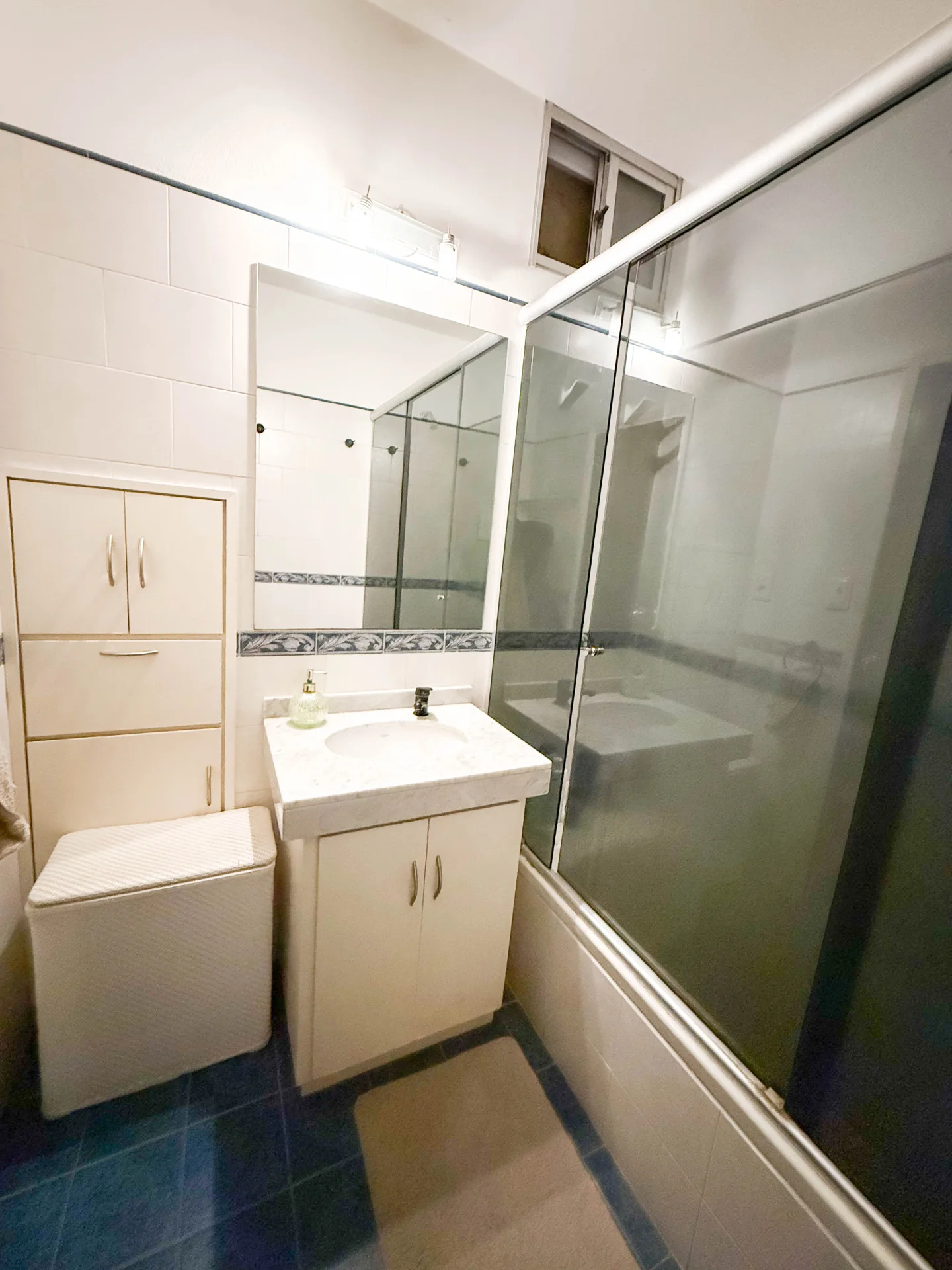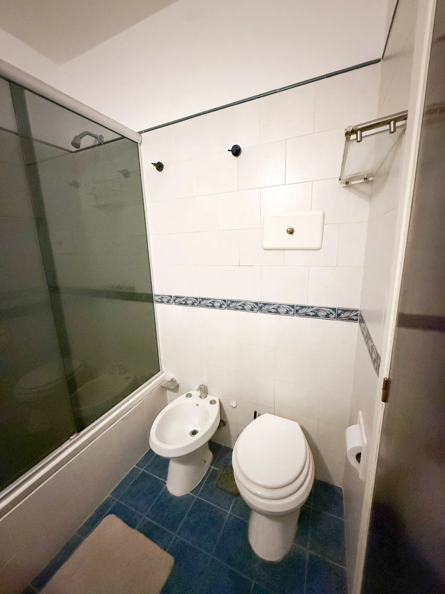 - Un baño completo con bañera y mampara.