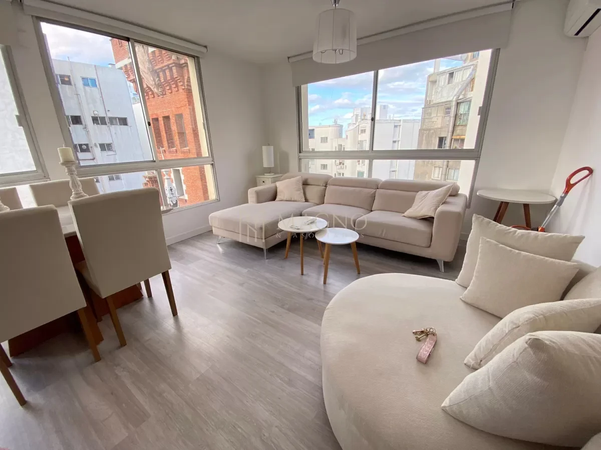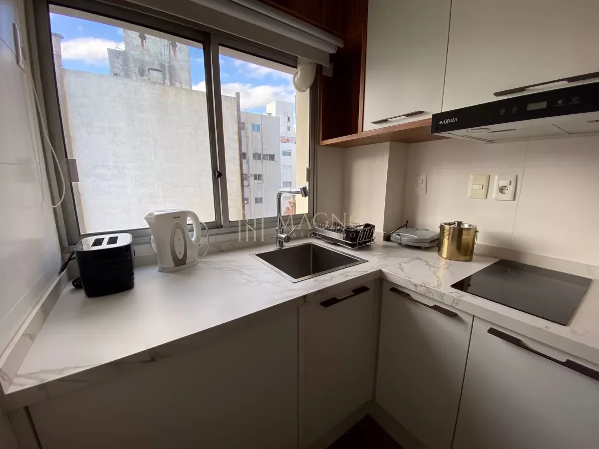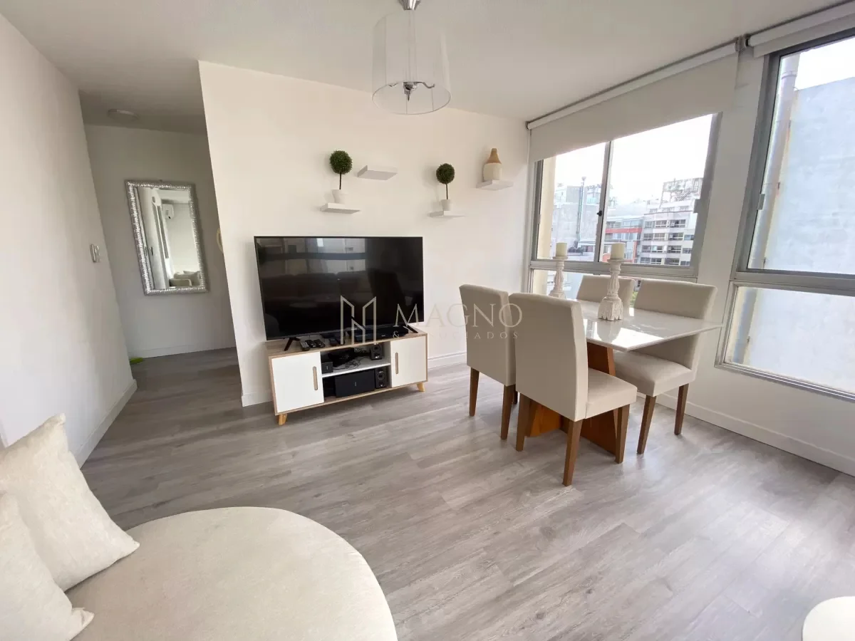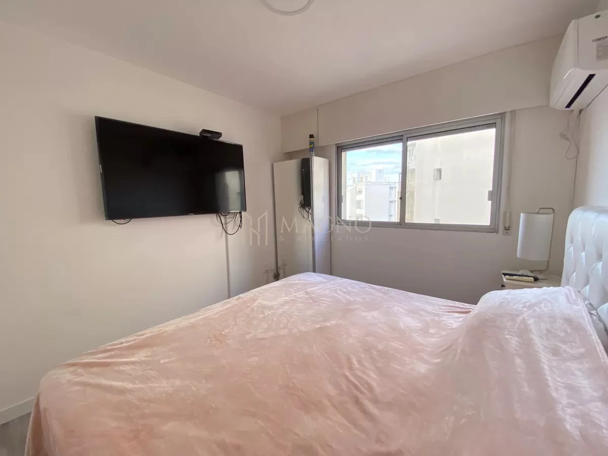 Apartamento en alquiler en Punta Carretas, ubicado a una cuadra de la rambla sobre Francisco Vidal. Situado en un octavo piso, este apartamento está completamente amoblado y equipado, presentando living comedor con ventanales y vista al exterior, cocina definida equipada con electrodomésticos y dormitorio con baño en suite. El ambiente cuenta con cortinas eléctricas y mobiliario de alta calidad.