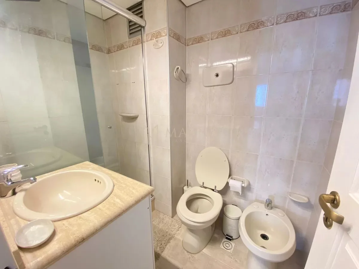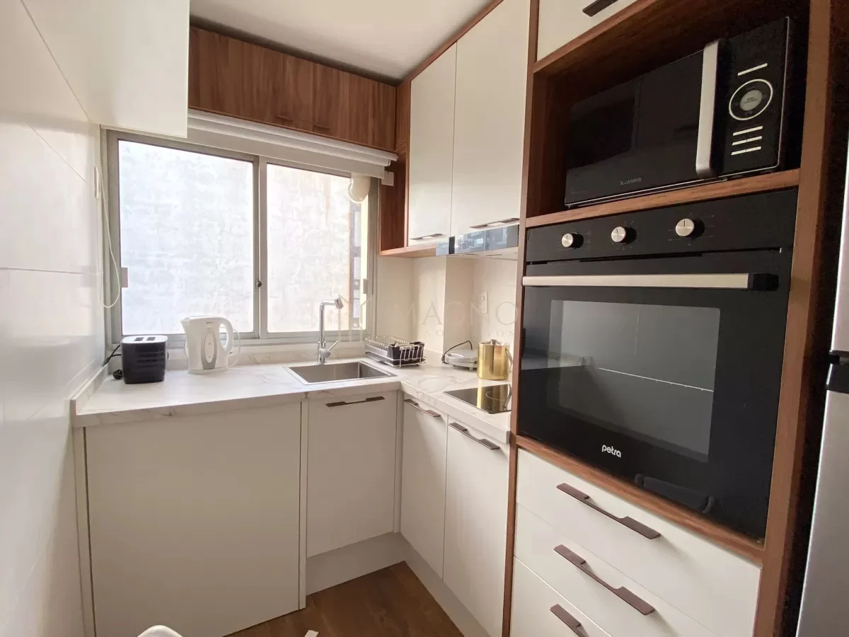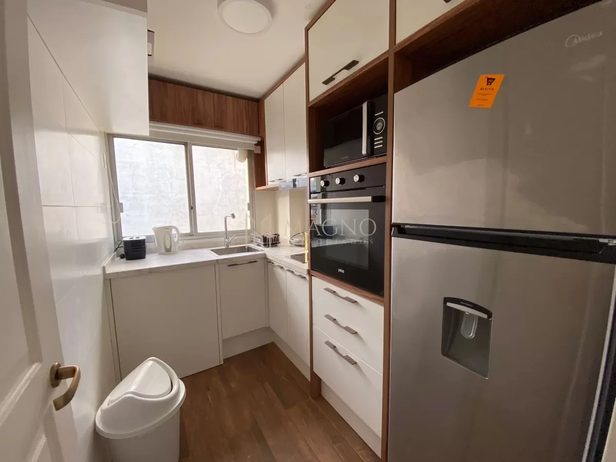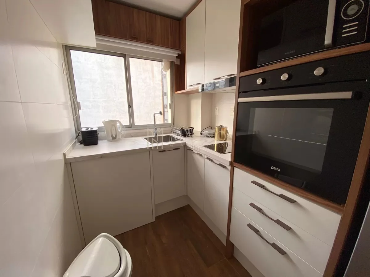 Apartamento en alquiler en Punta Carretas, ubicado a una cuadra de la rambla sobre Francisco Vidal. Situado en un octavo piso, este apartamento está completamente amoblado y equipado, presentando living comedor con ventanales y vista al exterior, cocina definida equipada con electrodomésticos y dormitorio con baño en suite. El ambiente cuenta con cortinas eléctricas y mobiliario de alta calidad.