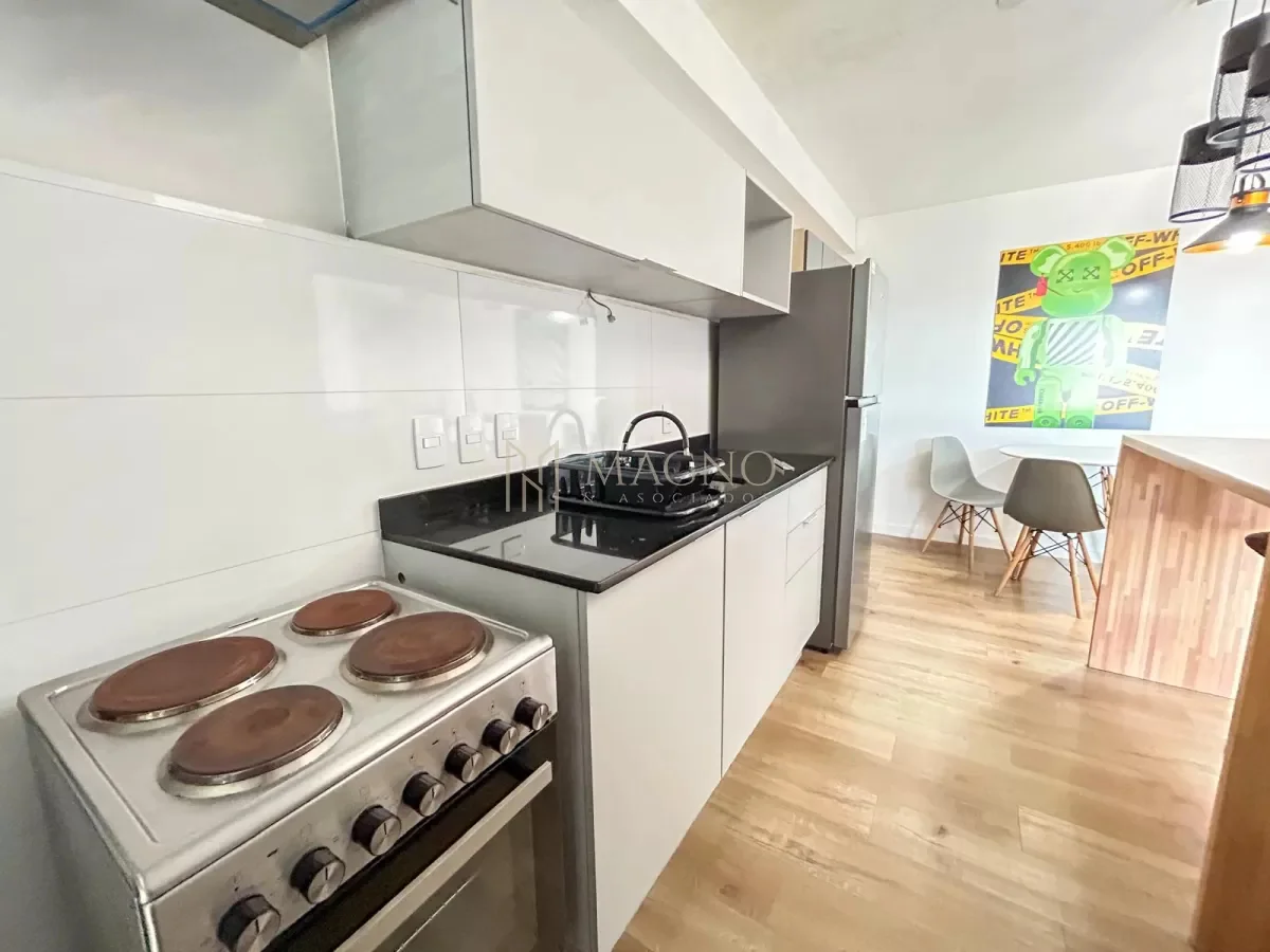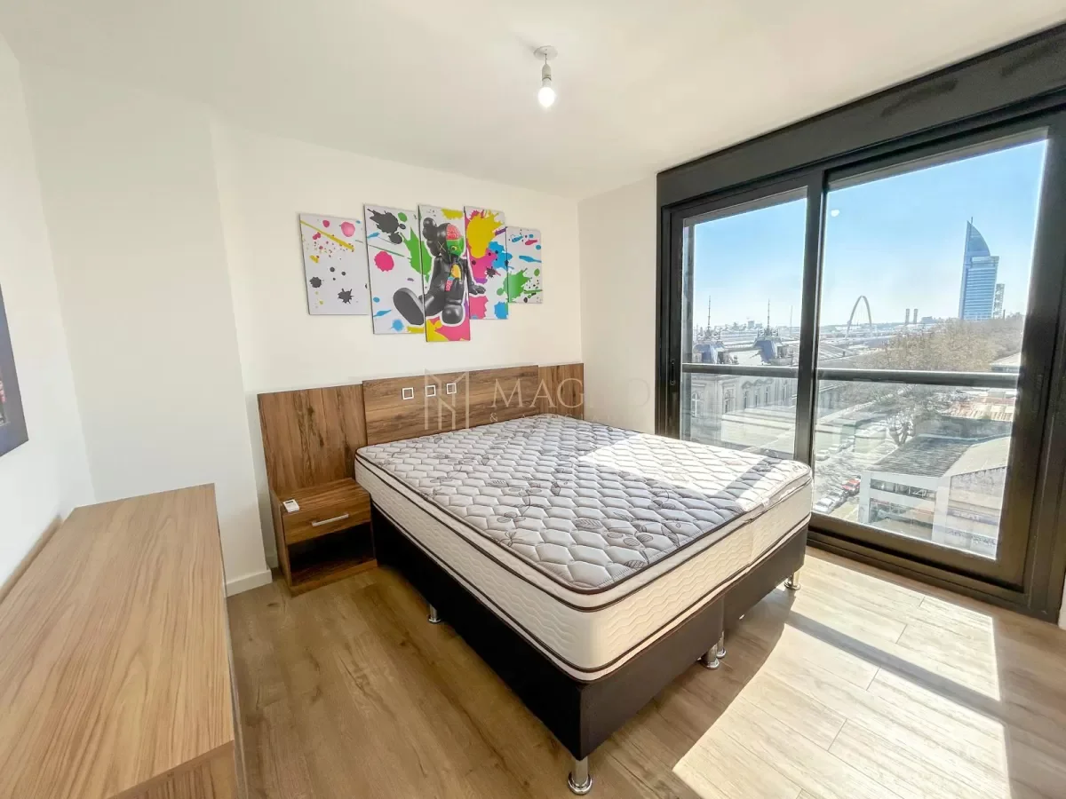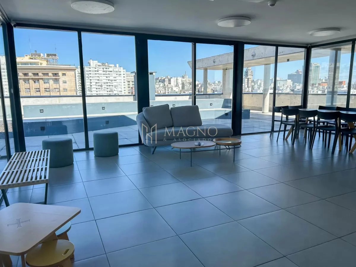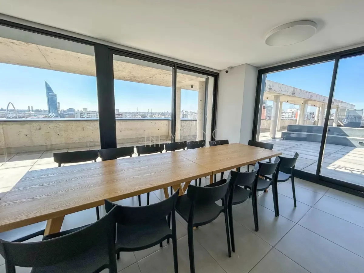 Apartamento totalmente equipado en el edificio Nostrum Central, ubicado sobre Paraguay y La Paz, en pleno Centro. Se encuentra en el piso 8 al frente, con orientación norte y acceso a balcón con vista panorámica.