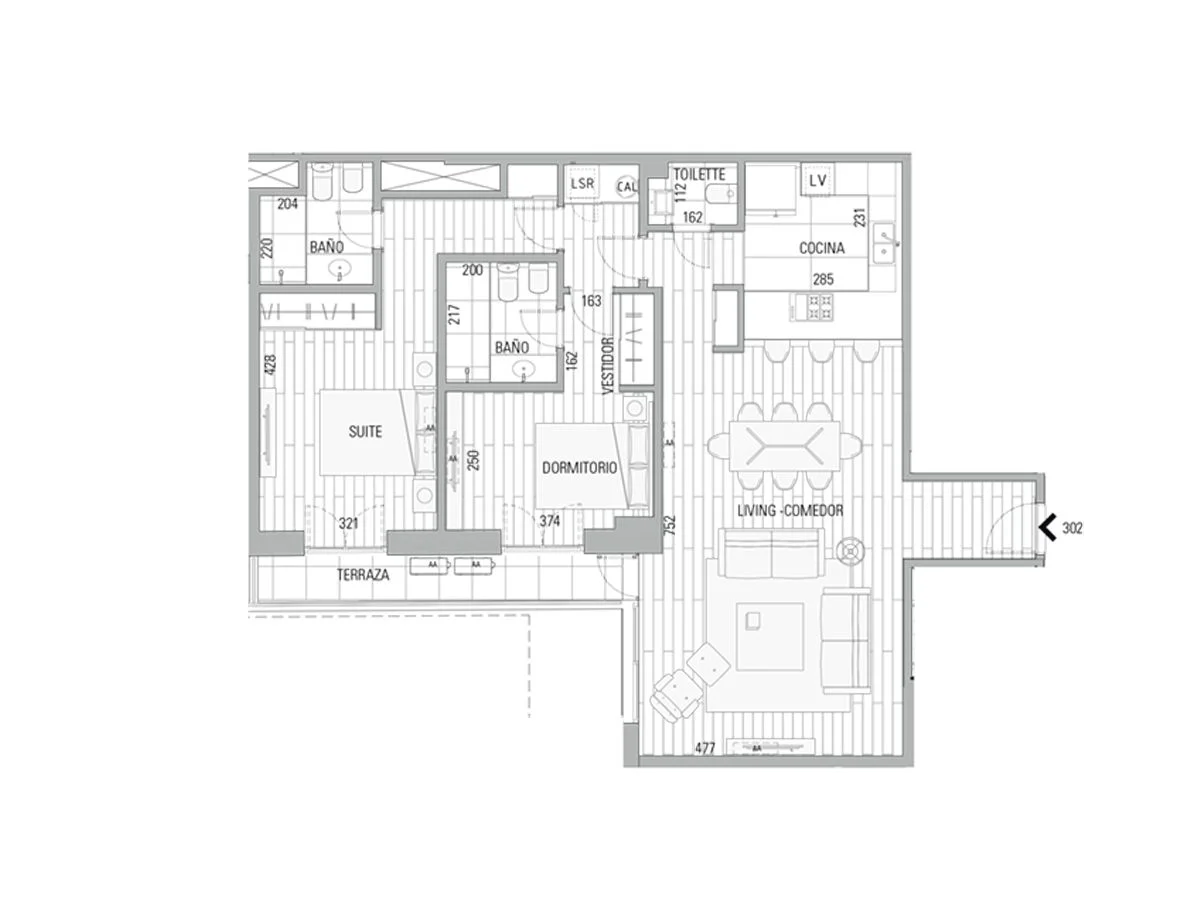 107,67m² interiores + 5,77m² terraza cubierta= 113,44m² de uso exclusivo + 69,54m² espacios comunes= total 182,98m²