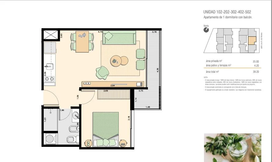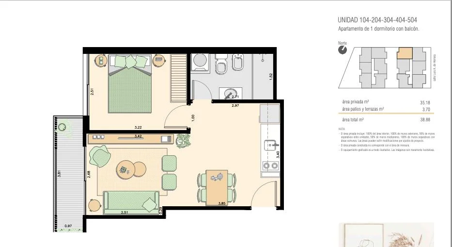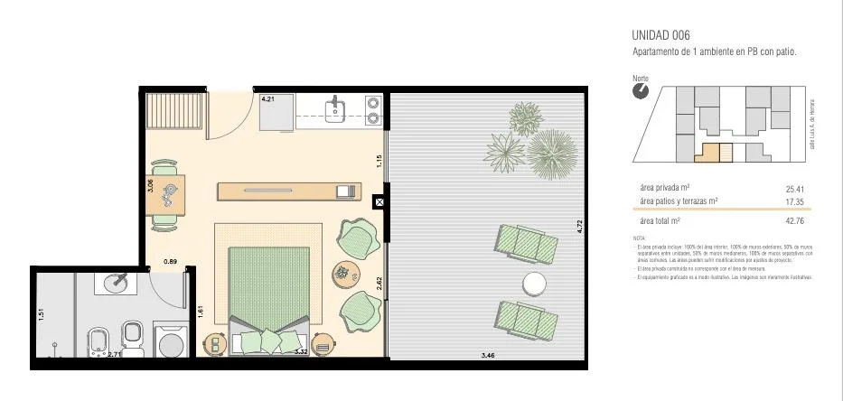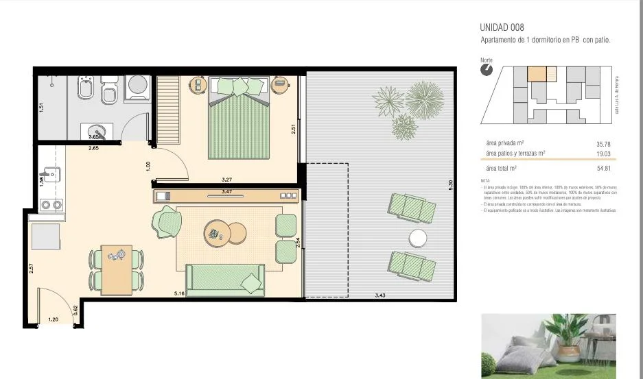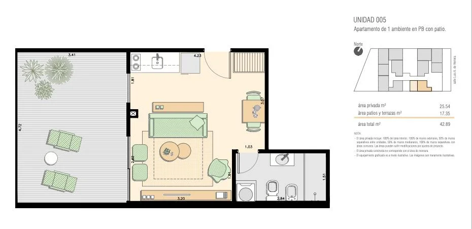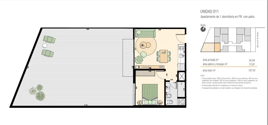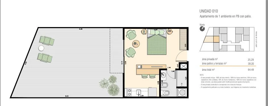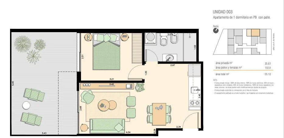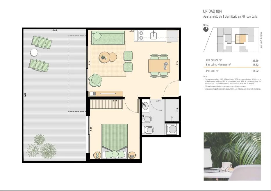 Con 1 dormitorio y 1 baño, este apartamento cuenta con un hermoso patio privado. La disposición al frente garantiza una excelente iluminación natural.