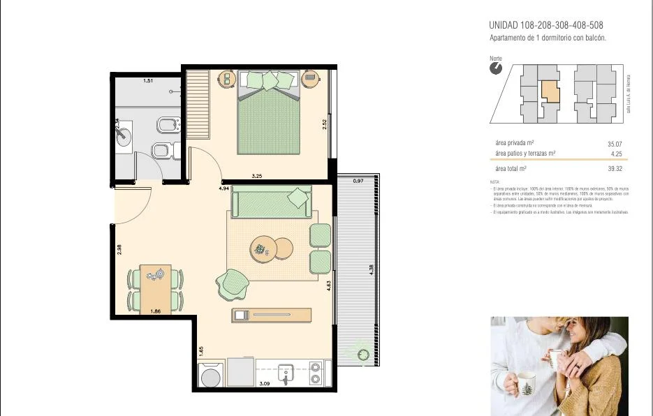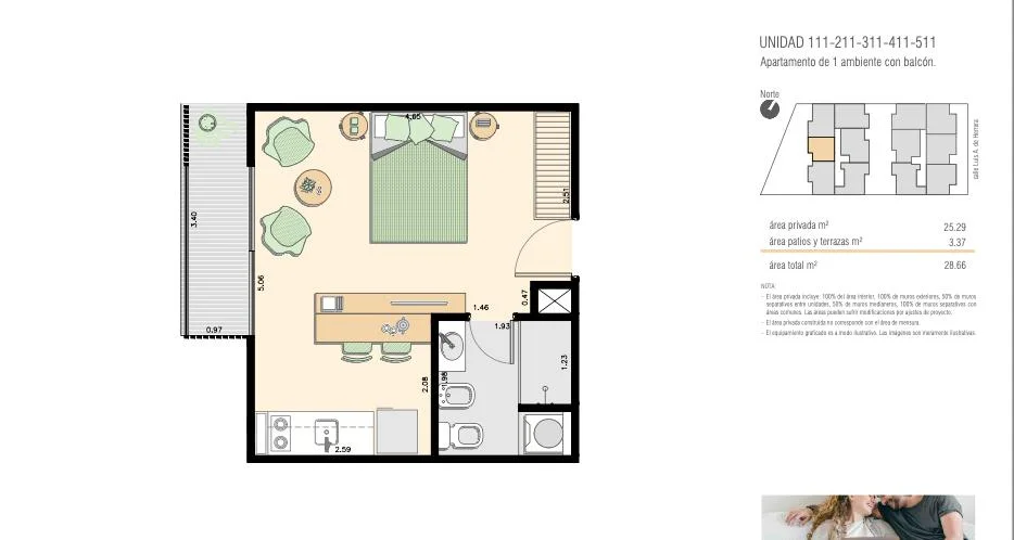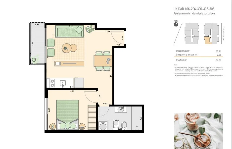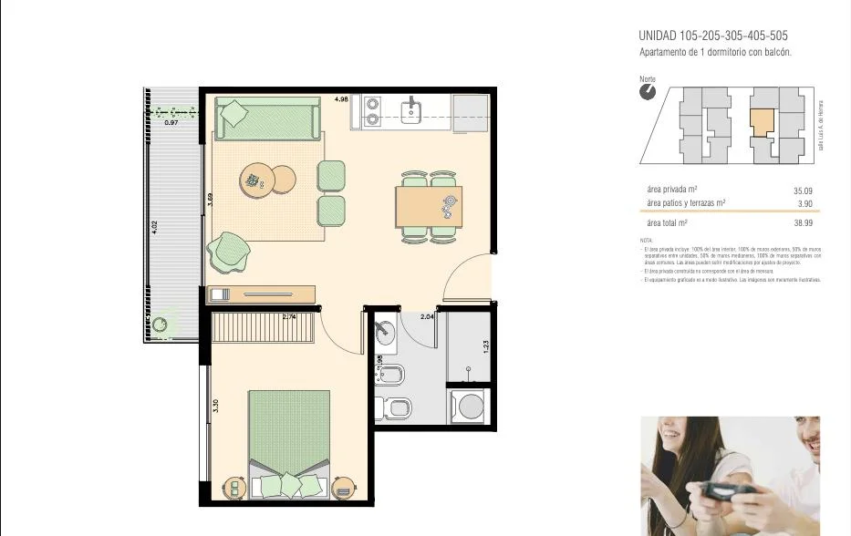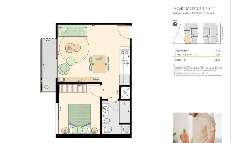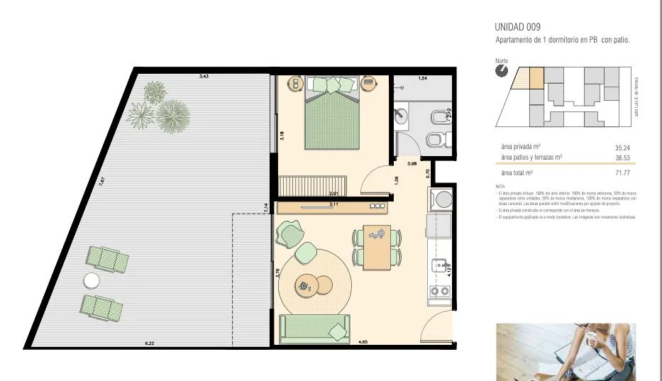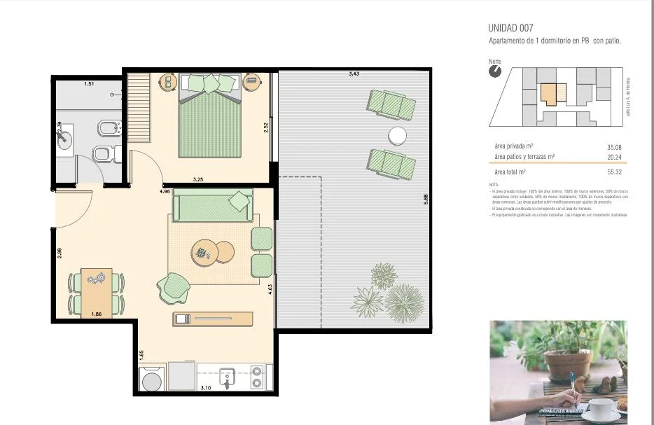 Con 1 dormitorio y 1 baño, este apartamento cuenta con un hermoso patio privado. La disposición al frente garantiza una excelente iluminación natural.